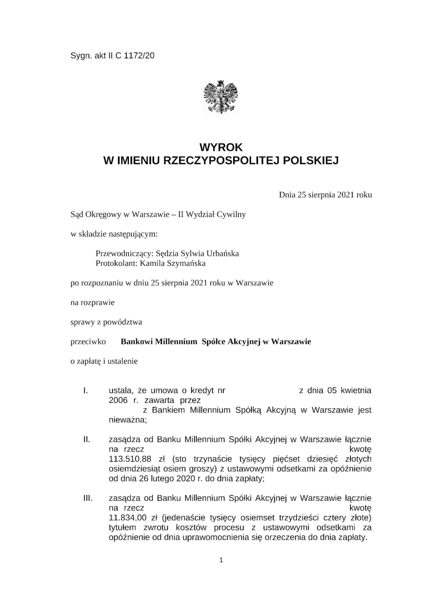 Pozew został wniesiony w maju 2020 r., zaś wyrok Sądu I instancji wydany został dnia 25 sierpnia 2021 r. przez Sąd Okręgowy w Warszawie w składzie SSO Sylwia Urbańska, sygn. akt II C 1172/20.