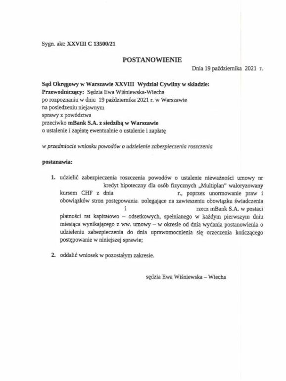 Sąd Okręgowy w Warszawie w składzie SSO Ewa Wiśniewska-Wiecha po rozpoznaniu w dniu 19 października 2021 r. na posiedzeniu niejawnym sprawy z powództwa naszych Klientów przeciwko mBank S.A. z siedzibą w Warszawie o ustalenie i zapłatę, sygn. akt. XXVIII C 13500/21, postanowił udzielić zabezpieczenia roszczenia o ustalenie nieważności umowy o kredyt hipoteczny.