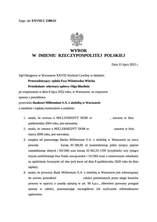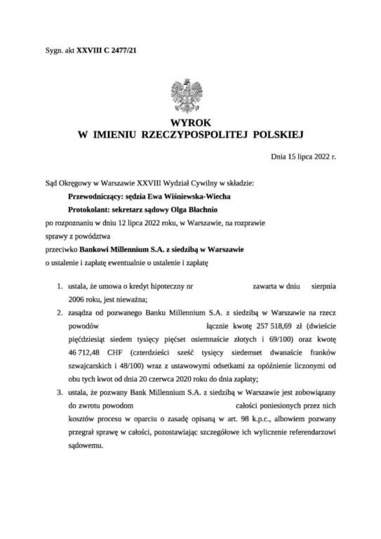 Sąd Okręgowy w Warszawie XXVIII Wydział Cywilny w składzie SSO Ewa Wiśniewska-Wiecha wyrokiem z dnia 15 lipca 2022 r. w sprawie przeciwko Bankowi Millennium S.A. o sygn. XXVIII C 2477/21, ustalił, że umowa łącząca naszych Klientów z bankiem jest nieważna, a także zasądził na rzecz naszych Klientów kwotę 257 518,69 PLN i 46 712,48 CHF, czyli wszystkie dochodzone pozwem należności wraz z odsetkami ustawowymi liczonymi od dnia wskazanego w wezwaniu do zapłaty. Ponadto, Sąd wskazał, że bank zostaje w całości obciążony kosztami procesu, gdyż przegrał sprawę w całości.