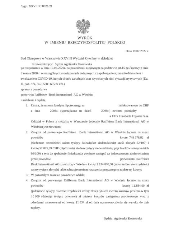 Sąd Okręgowy w Warszawie XXVIII Wydział Cywilny w składzie SSR del. Agnieszka Kossowska wyrokiem z dnia 19 lipca 2022 r. wydanym na posiedzeniu niejawnym w sprawie przeciwko Raiffeisen Bank International AG w Wiedniu, o sygn. akt XXVIII C 8621/21, ustalił, że umowa łącząca strony jest nieważna, a także zasądził na rzecz naszych Klientów kwotę 748 976,82 PLN oraz kwotę 57 075,99 CHF, czyli wszystkie dochodzone pozwem należności. Sąd zasądził również od Banku na rzecz naszych Klientów zwrot kosztów procesu.