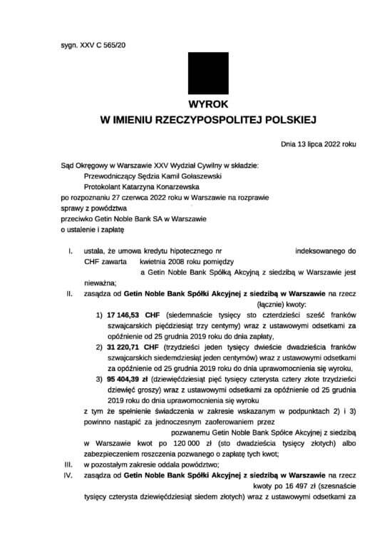 Sąd Okręgowy w Warszawie XXV Wydział Cywilny w składzie SSR del. Kamil Gołaszewski wyrokiem z dnia 13 lipca 2022 r. w sprawie przeciwko Getin Noble Bankowi S.A. o sygn. XXV C 565/20, ustalił, że umowa łącząca naszych Klientów z bankiem jest nieważna, a także zasądził na rzecz naszych Klientów kwotę 95 404,39 PLN, 17 146,53 CHF oraz 31 220,71 CHF, czyli wszystkie dochodzone pozwem należności wraz z odsetkami ustawowymi liczonymi dla każdej z kwot od dnia wskazanego w wezwaniu do zapłaty.