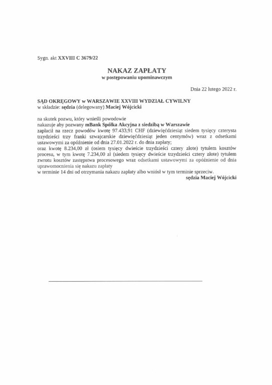 Sąd Okręgowy w Warszawie XXVIII Wydział Cywilny w składzie SSR del. Maciej Wójcicki wydał w dniu 22 lutego 2022 r. nakaz zapłaty w postępowaniu upominawczym przeciwko mBank S.A., w sprawie o sygn. akt XXVIII C 3679/22, uwzględniając w całości roszczenia naszych Klientów.