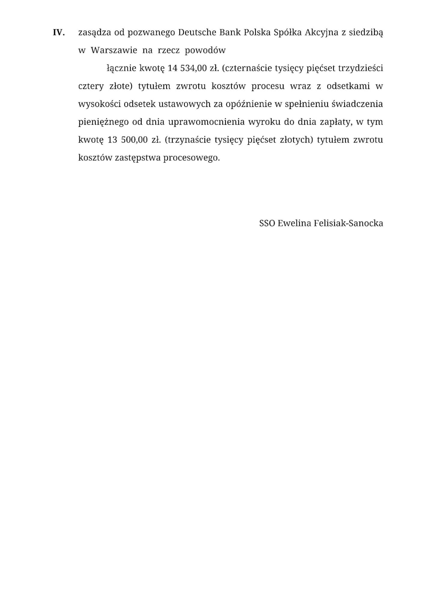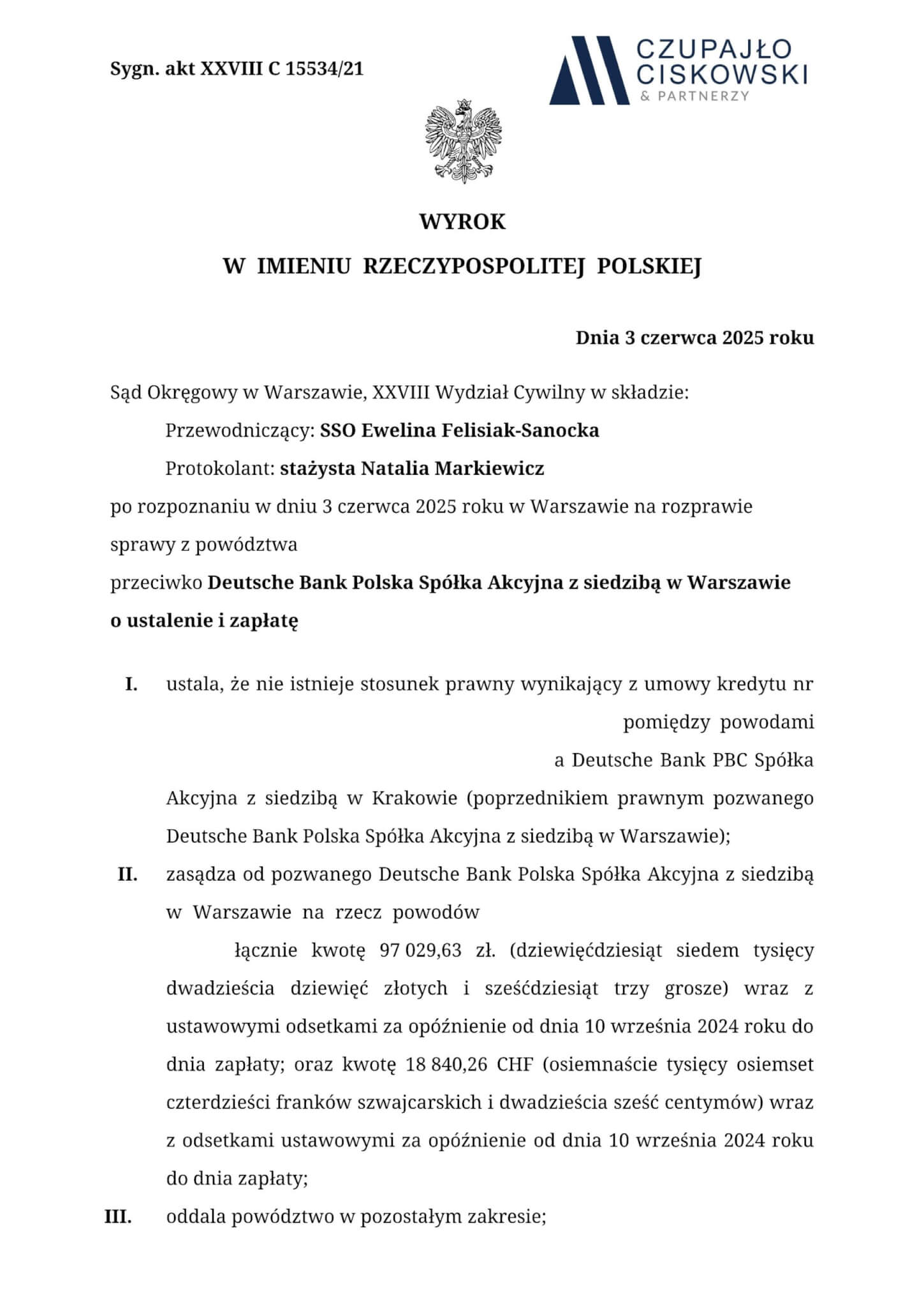 Sąd Okręgowy w Warszawie XXVIII Wydział Cywilny w składzie SSO Eweliny Felisiak-Sanockiej wyrokiem z dnia 3 czerwca 2025 r. w sprawie przeciwko Deutsche Bank Polska S.A. z siedzibą w Warszawie prowadzonej pod sygn. akt XXVIII C 15534/21 ustalił, że umowa kredytu hipotecznego łącząca naszych Klientów z bankiem jest nieważna. Ponadto zasądził na rzecz naszych Klientów kwotę 97 029,63 PLN oraz 18 840,26 CHF wraz z odsetkami ustawowymi za opóźnienie od wezwania banku do zapłaty.
