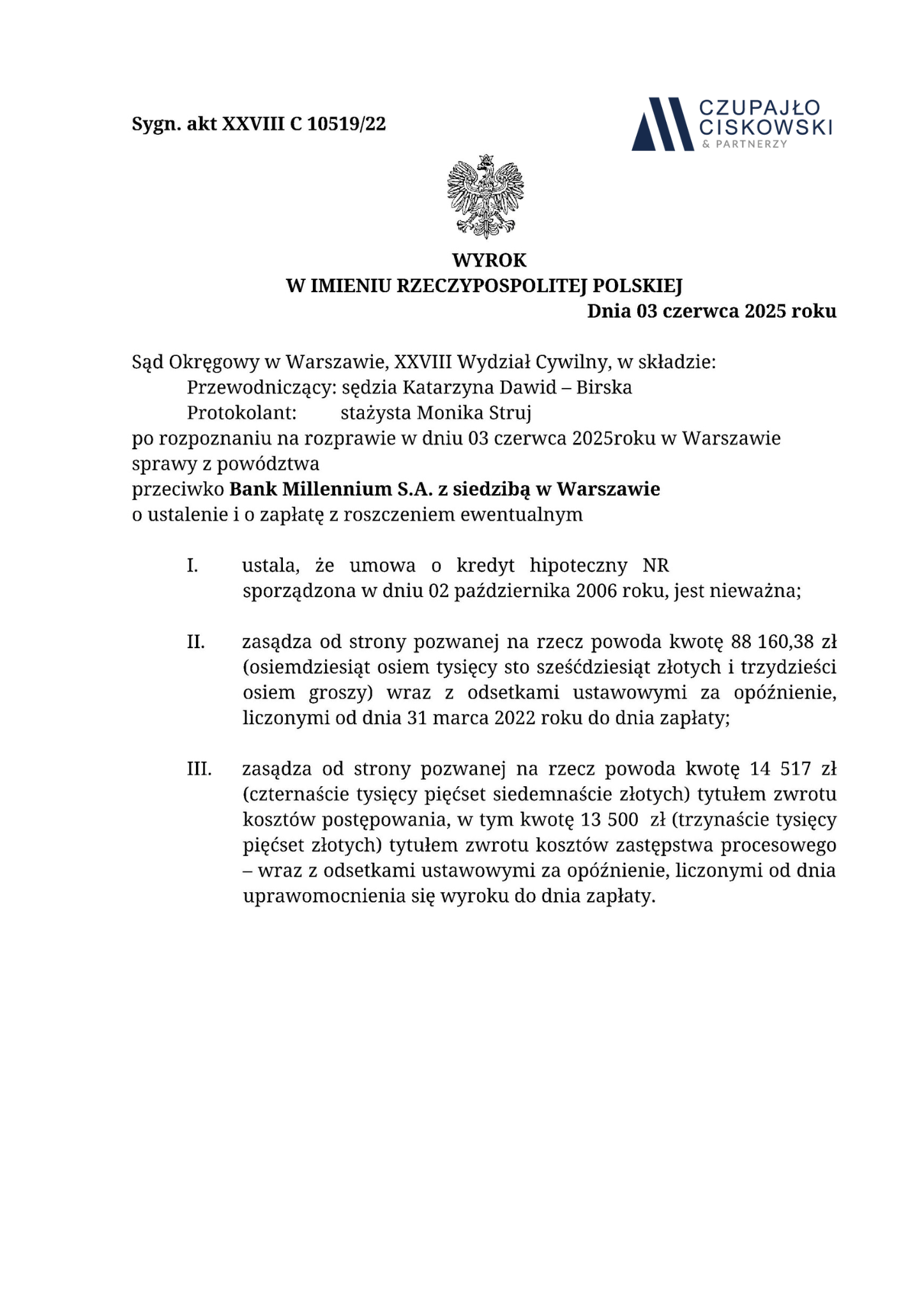 Sąd Okręgowy w Warszawie XXVIII Wydział Cywilny w składzie sędzia Katarzyna Dawid-Birska wyrokiem z dnia 3 czerwca 2025 roku w sprawie przeciwko Bankowi Millennium S.A. prowadzonej pod sygn. akt XXVIII C 10519/22 ustaliła, że umowa kredytu hipotecznego łącząca naszego Klienta z bankiem jest nieważna. Ponadto zasądzono na rzecz naszego Klienta kwotę 88 160,38 PLN wraz z odsetkami ustawowymi za opóźnienie od dnia wezwania do zapłaty.