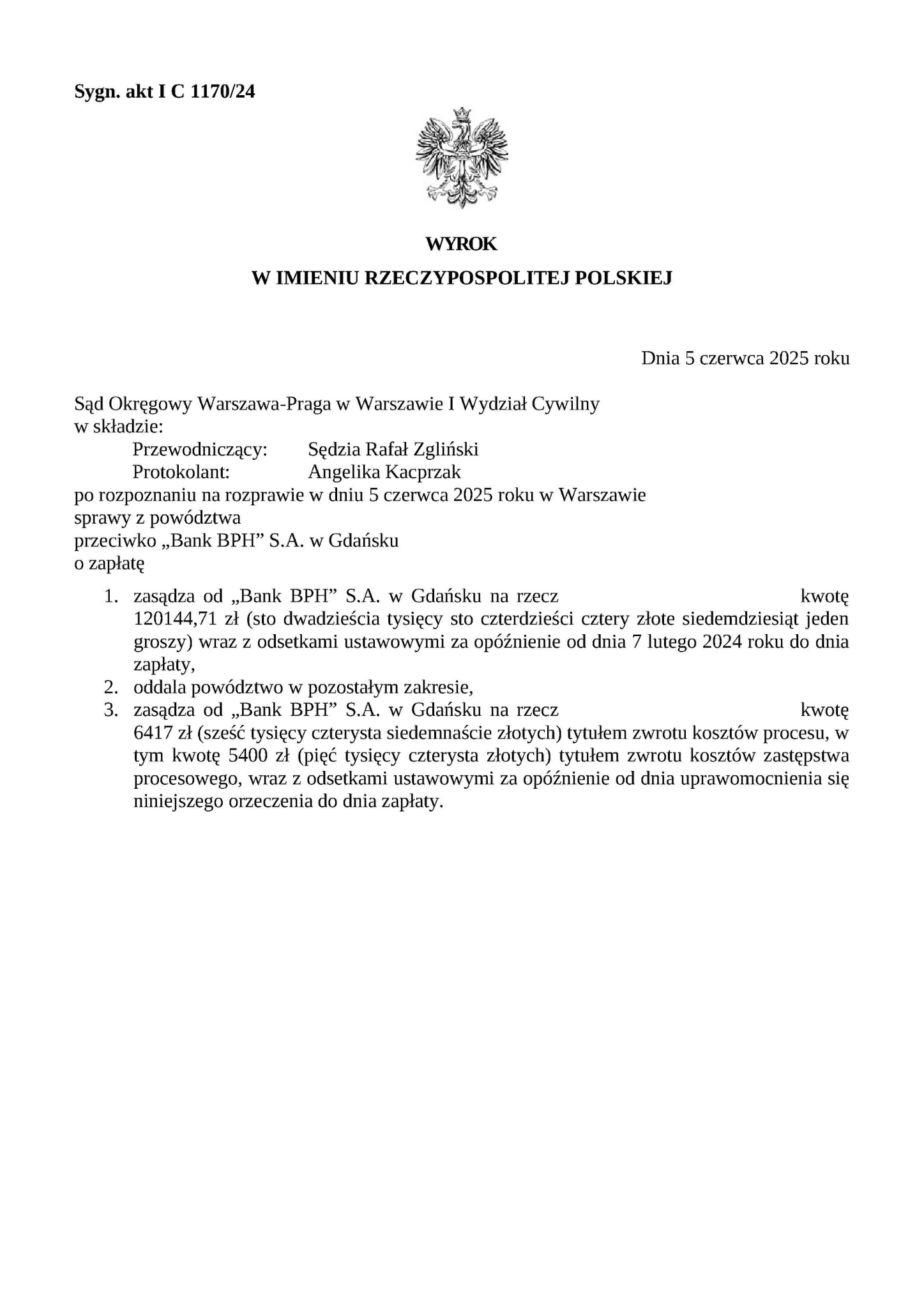 Sąd Okręgowy Warszawa-Praga w Warszawie I Wydział Cywilny w składzie sędzia Rafał Zgliński wyrokiem z dnia 5 czerwca 2025 roku w sprawie przeciwko Bankowi BPH S.A. prowadzonej pod sygn. akt I C 1170/24 zasądził na rzecz naszych Klientów kwotę 120 144,71 PLN wraz z odsetkami ustawowymi za opóźnienie od dnia wezwania do zapłaty.