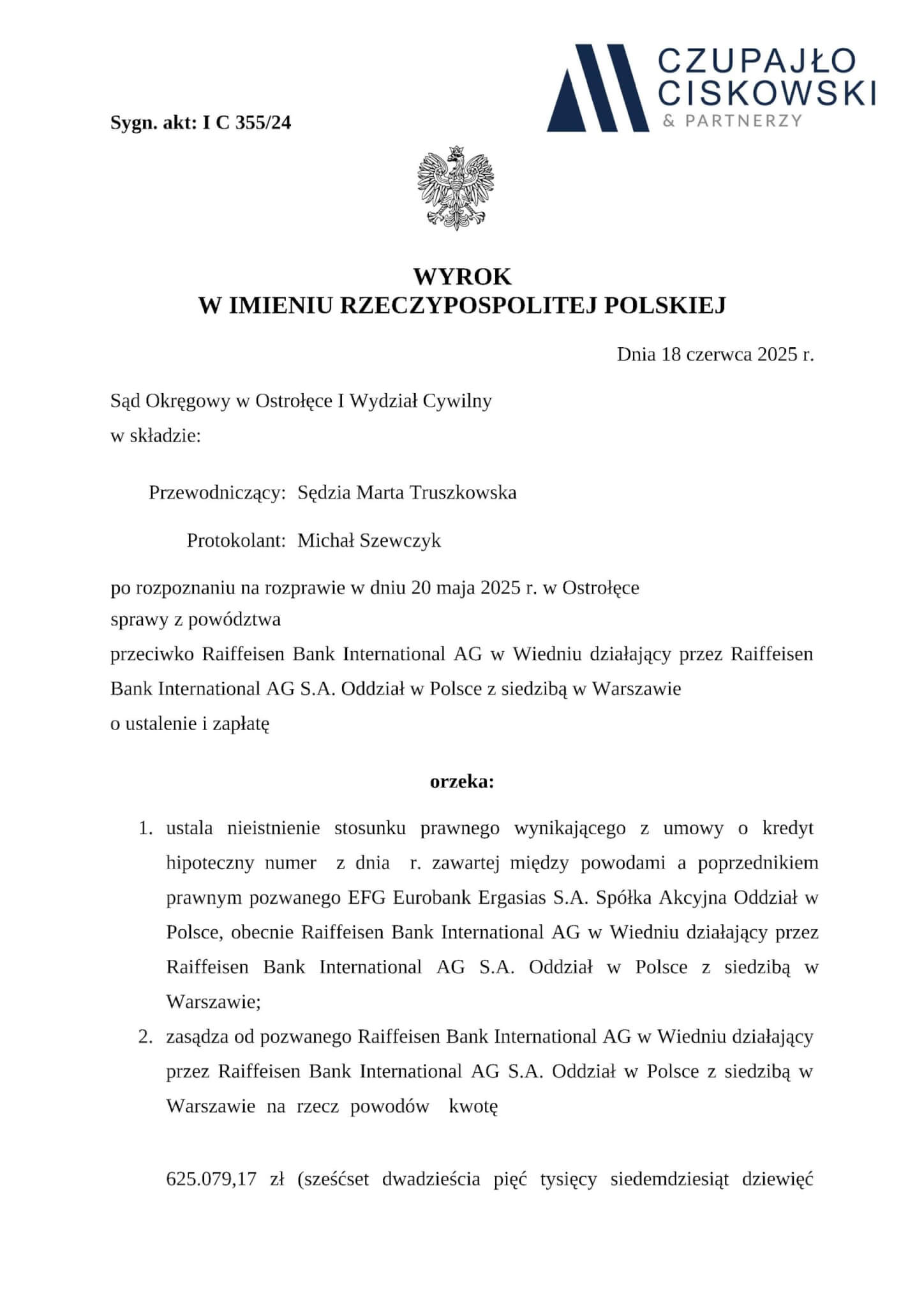 Sąd Okręgowy w Ostrołęce, I Wydział Cywilny w składzie SSO Marta Truszkowska wyrokiem z dnia 18 czerwca 2025 r. w sprawie przeciwko Raiffeisen Bank International AG działający przez Raiffeisen Bank International AG (Spółka Akcyjna) Oddział w Polsce prowadzonej pod sygn. akt I C 355/24 ustalił, że umowa kredytu hipotecznego łącząca naszych Klientów z bankiem jest nieważna. Ponadto zasądził na rzecz naszych Klientów kwotę 625 079,17 PLN wraz z odsetkami ustawowymi liczonymi od kwoty 609 421,52 PLN od dnia wskazanego w wezwaniu do zapłaty oraz od kwoty 15 657,65 PLN liczonymi od dnia następującego po dniu doręczenia odpisu pozwu pozwanemu.