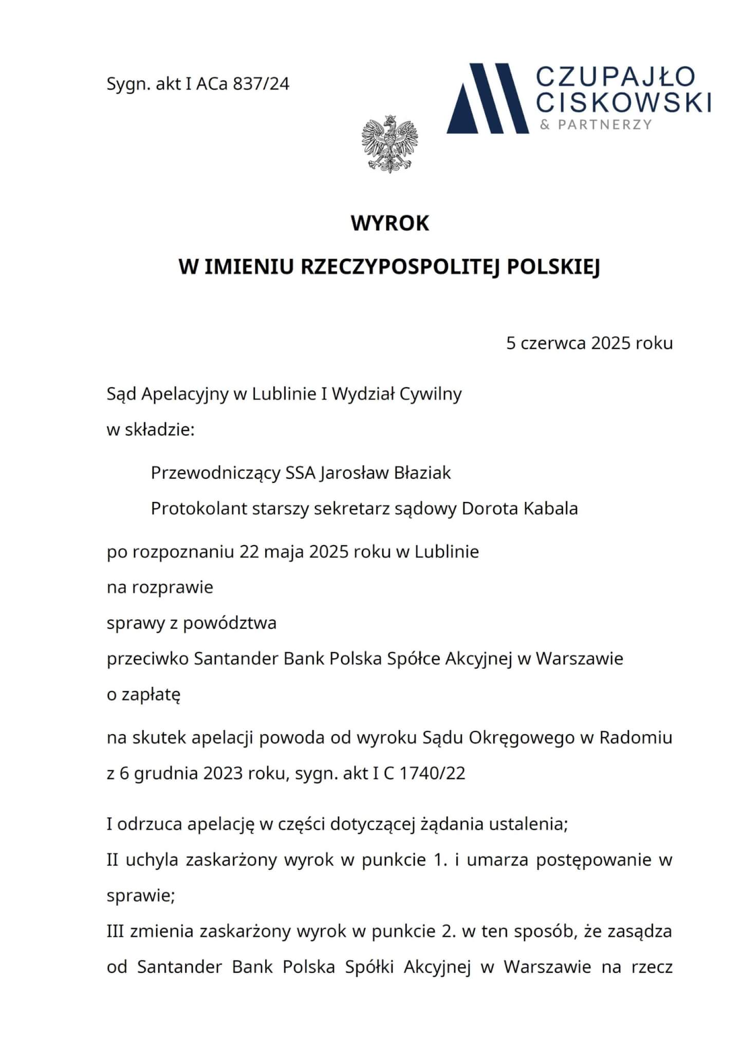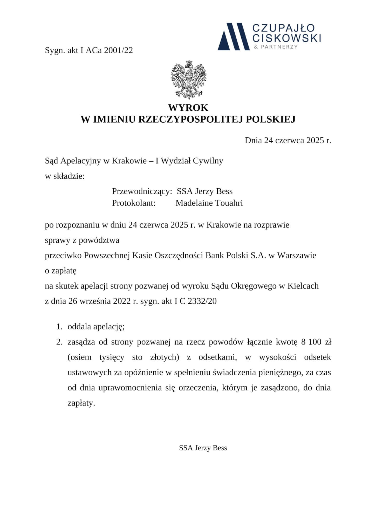 Sąd Apelacyjny w Krakowie, I Wydział Cywilny w składzie SSA Jerzego Bess wyrokiem z dnia 24 czerwca 2025 r., w sprawie przeciwko Powszechnej Kasie Oszczędności Bank Polski S.A. z siedzibą w Warszawie, prowadzonej pod sygn. akt I ACa 2001/22 utrzymał wyrok Sądu Okręgowego w Kielcach (sygn. akt I C 2332/20) unieważniający umowę kredytu zawartą przez naszych klientów z bankiem oraz zasądzający na ich rzecz kwotę 250 743,24 PLN oraz kwotę 13 734,21 CHF wraz z odsetkami za opóźnienie od dnia wystosowania wezwania do zapłaty do banku.