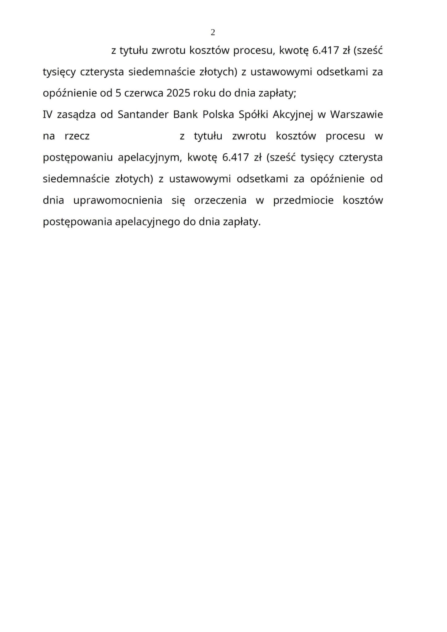 Sąd Apelacyjny w Warszawie, VI Wydział Cywilny w składzie Jacek Sadomski wyrokiem z dnia 4 czerwca 2025 r. w sprawie przeciwko Powszechnej Kasie Oszczędności Bank Polski S.A. prowadzonej pod sygn. akt VI ACa 3714/23 zmienił wyrok Sądu Okręgowego w Warszawie (sygn. akt III C 1022/18) zasądził na rzecz Powódki odsetki ustawowe za opóźnienie.