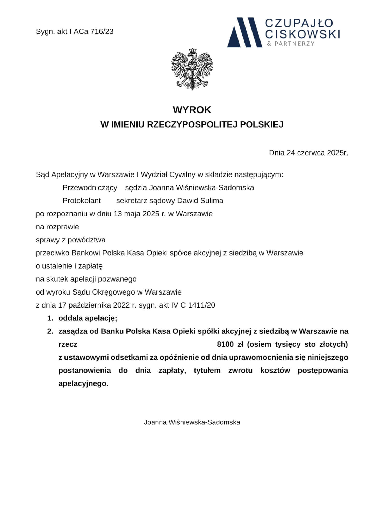 Sąd Apelacyjny w Warszawie, I Wydział Cywilny w składzie SSA Joanny Wiśniewskiej-Sadomskiej wyrokiem z dnia 24 czerwca 2025 r., w sprawie przeciwko Bankowi Polska Kasa Opieki S.A. z siedzibą w Warszawie, prowadzonej pod sygn. akt I ACa 716/23 utrzymał wyrok Sądu Okręgowego w Warszawie (sygn. akt IV C 1411/20) unieważniający umowę kredytu zawartą przez naszych klientów z bankiem oraz zasądzający na rzecz każdego z nich kwotę 378 206,03 PLN wraz z odsetkami za opóźnienie od dnia wystosowania wezwania do zapłaty do banku.