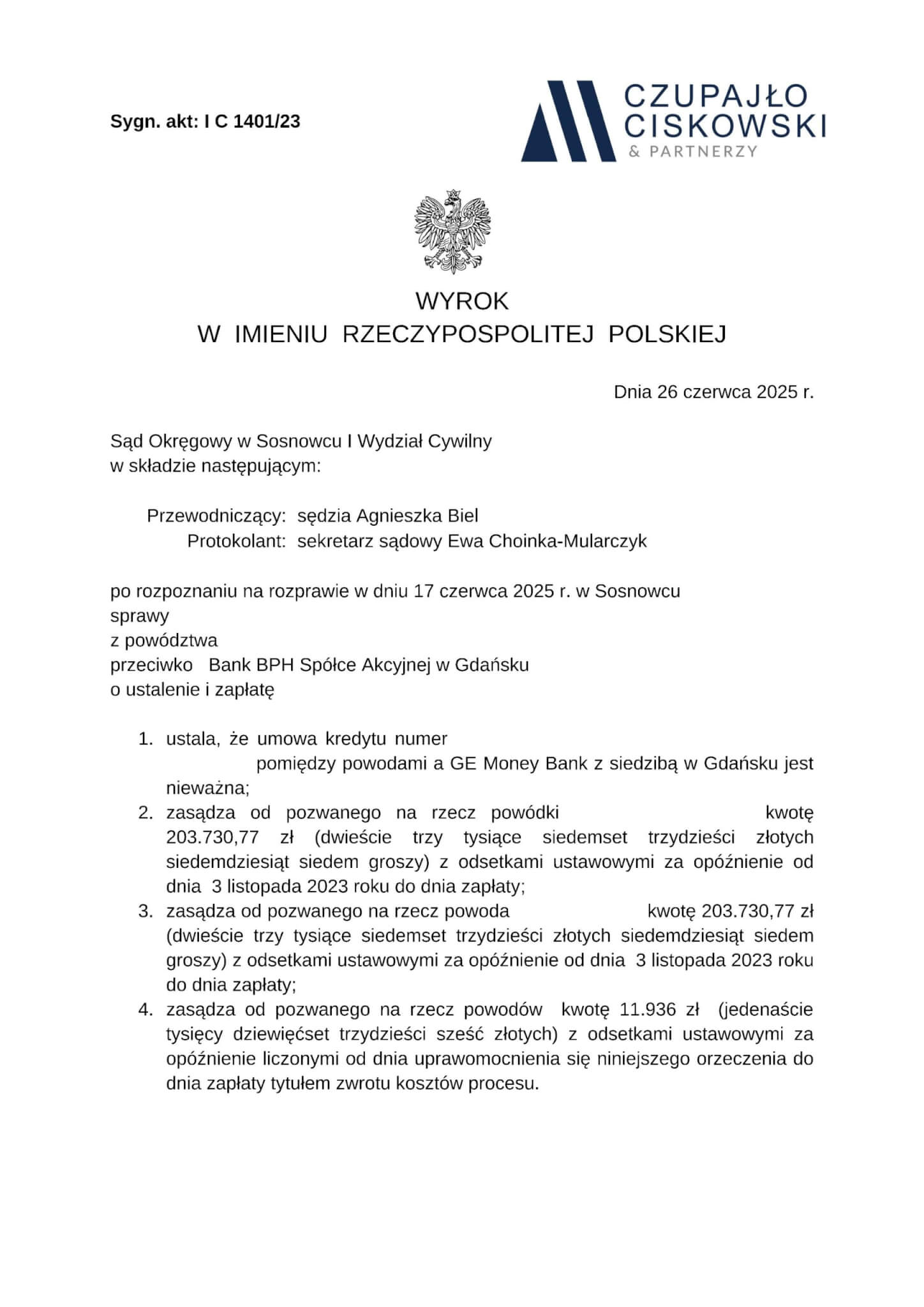 Sąd Okręgowy w Sosnowcu I Wydział Cywilny w składzie SSO Agnieszki Biel wyrokiem z dnia 26 czerwca 2025 r. w sprawie przeciwko Bankowi BPH S.A. z siedzibą w Gdańsku prowadzonej pod sygn. akt I C 1401/23 ustalił, że umowa kredytu hipotecznego łącząca naszych Klientów z bankiem jest nieważna. Ponadto zasądził na rzecz naszych Klientów kwotę 407 461,54 PLN wraz z odsetkami ustawowymi za opóźnienie od wezwania banku do zapłaty