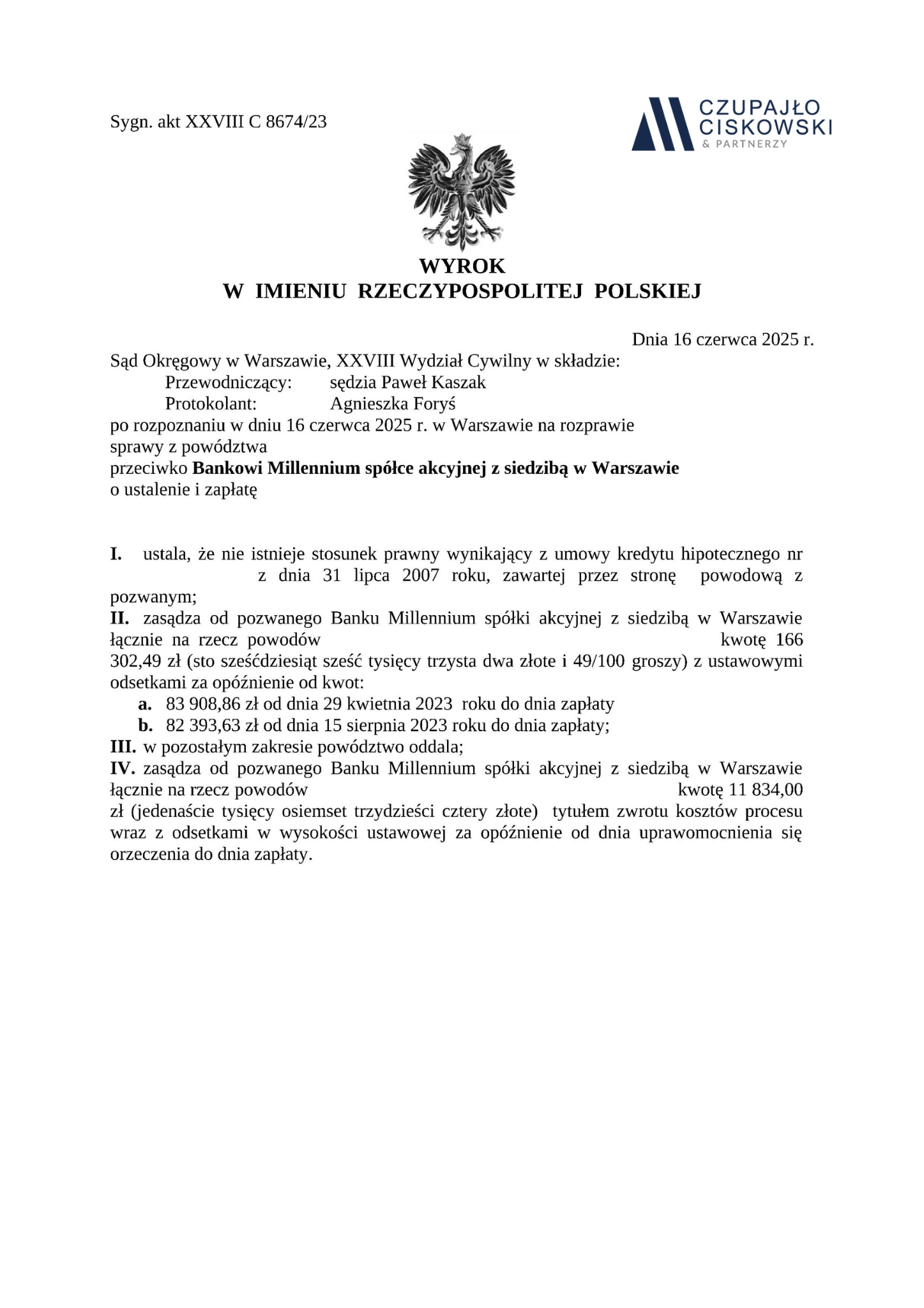 Sąd Okręgowy w Warszawie XXVIII Wydział Cywilny w składzie sędzia Paweł Kaszak wyrokiem z dnia 16 czerwca 2025 r. w sprawie przeciwko Bankowi Millennium S.A. prowadzonej pod sygn. akt XXVIII C 8674/23 ustalił, że umowa kredytu hipotecznego łącząca naszych Klientów z bankiem jest nieważna. Ponadto zasądził na rzecz naszych Klientów kwotę 166 302,49 PLN wraz z odsetkami ustawowymi od za opóźnienie.