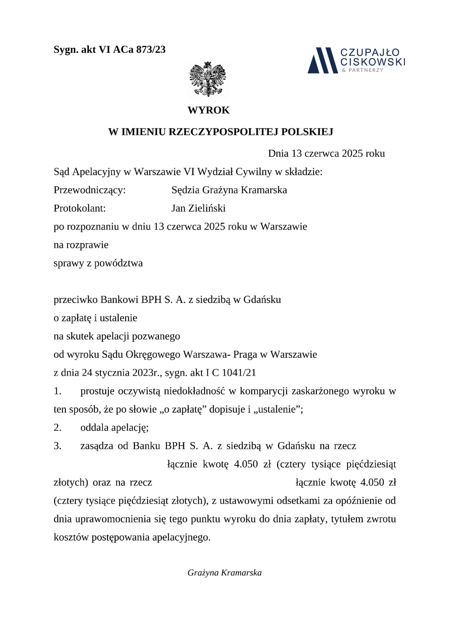 Sąd Apelacyjny w Warszawie VI Wydział Cywilny w składzie sędzia Grażyna Kramarska wyrokiem z dnia 13 czerwca 2025 roku w sprawie przeciwko Bankowi BPH S.A. prowadzonej pod sygn. akt VI ACa 873/23 oddaliła apelację banku.