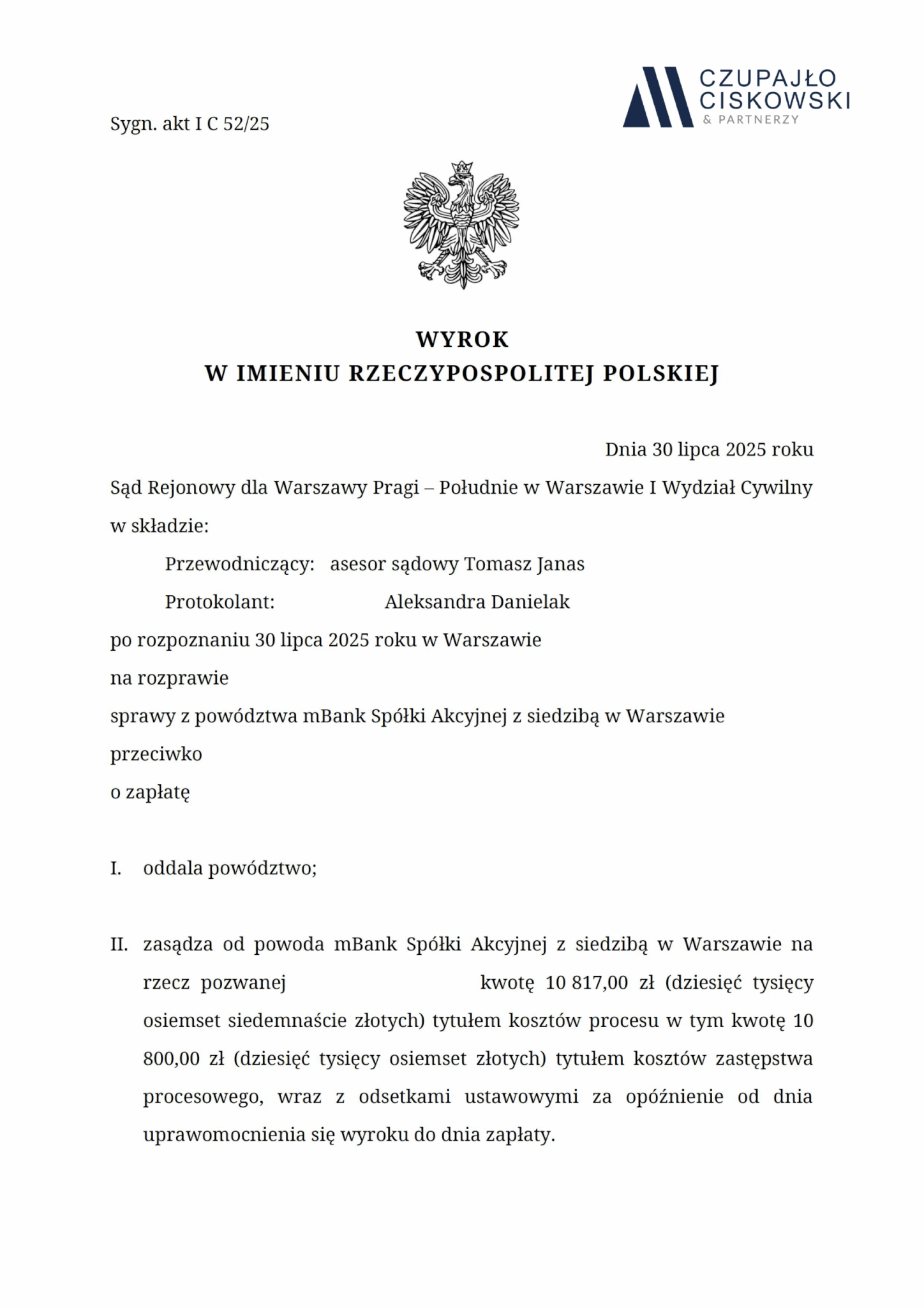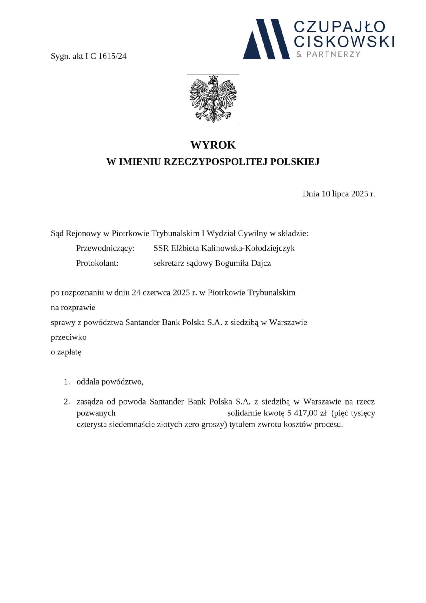 Sąd Okręgowy w Piotrkowie Trybunalskim , I Wydział Cywilny w składzie SSR Elżbieta Kalinowska-Kołodziejczyk wyrokiem z dnia 10 lipca 2025 r. w sprawie z powództwa Santander Bank Polska S.A. z siedzibą w Warszawie, przeciwko naszym Klientom prowadzonej pod sygn. akt I C 1615/24 Sąd oddalił powództwo banku o zapłatę oraz zasądził na rzecz naszych Klientów koszty zastępstwa procesowego.