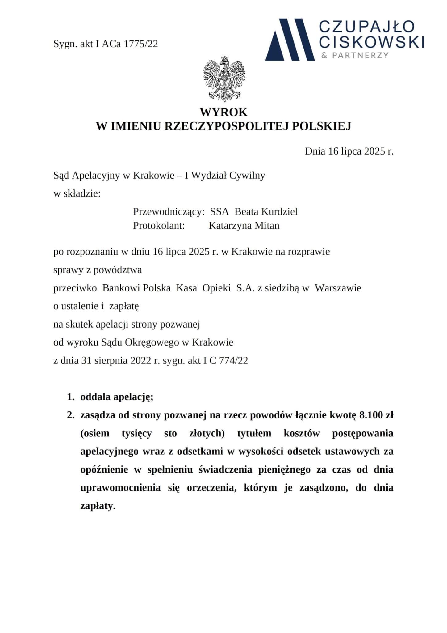 Sąd Apelacyjny w Krakowie, I Wydział Cywilny w składzie SSA Beata Kurdziel wyrokiem z dnia 16 lipca 2025 r. w sprawie przeciwko Bankowi Polska Kasa Opieki S.A. z siedzibą w Warszawie, prowadzonej pod sygn. akt I ACa 1775/22 utrzymał wyrok Sądu Okręgowego w Kraskowie (sygn. akt I C 774/22) i oddalił apelację z Banku.