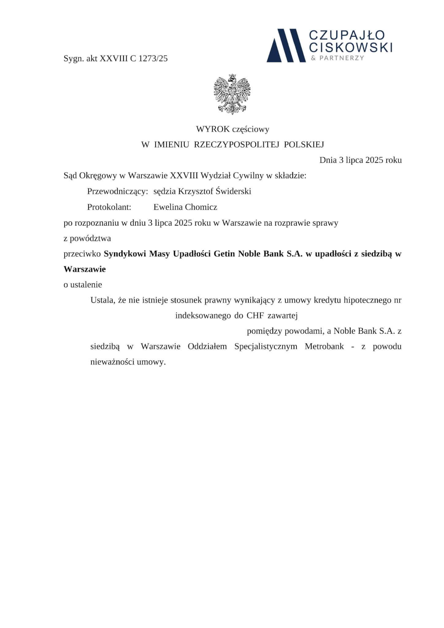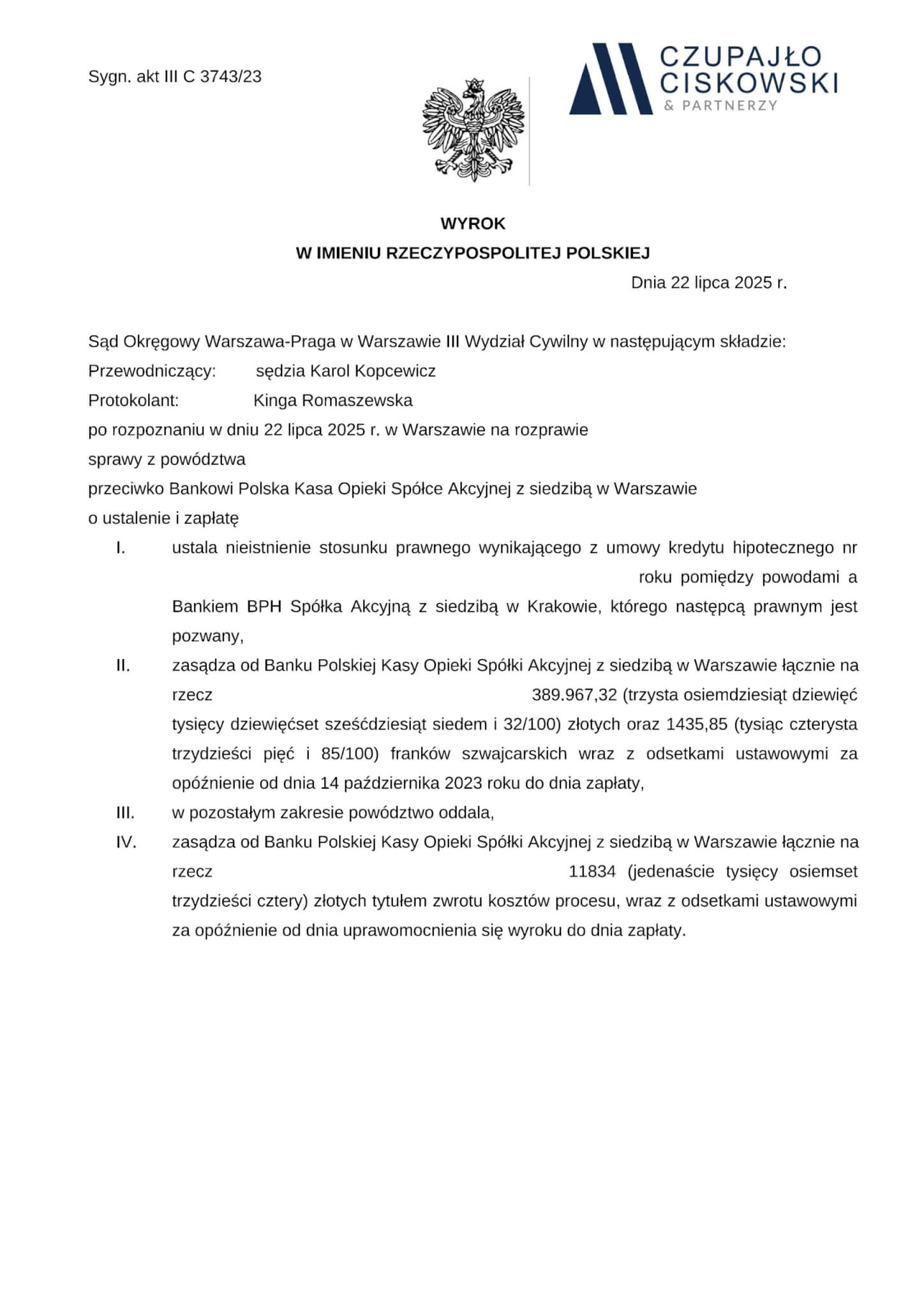 Sąd Okręgowy Warszawa-Praga w Warszawie ,III Wydział Cywilny w składzie SSO Karol Kopcewicz wyrokiem z dnia 22 lipca 2025 r. w sprawie Bankowi Polska Kasa Opieki S.A. z siedziba w Warszawie prowadzonej pod sygn. akt III C 3743/23 ustalił, że umowa kredytu hipotecznego łącząca naszych Klientów z bankiem jest nieważna.
