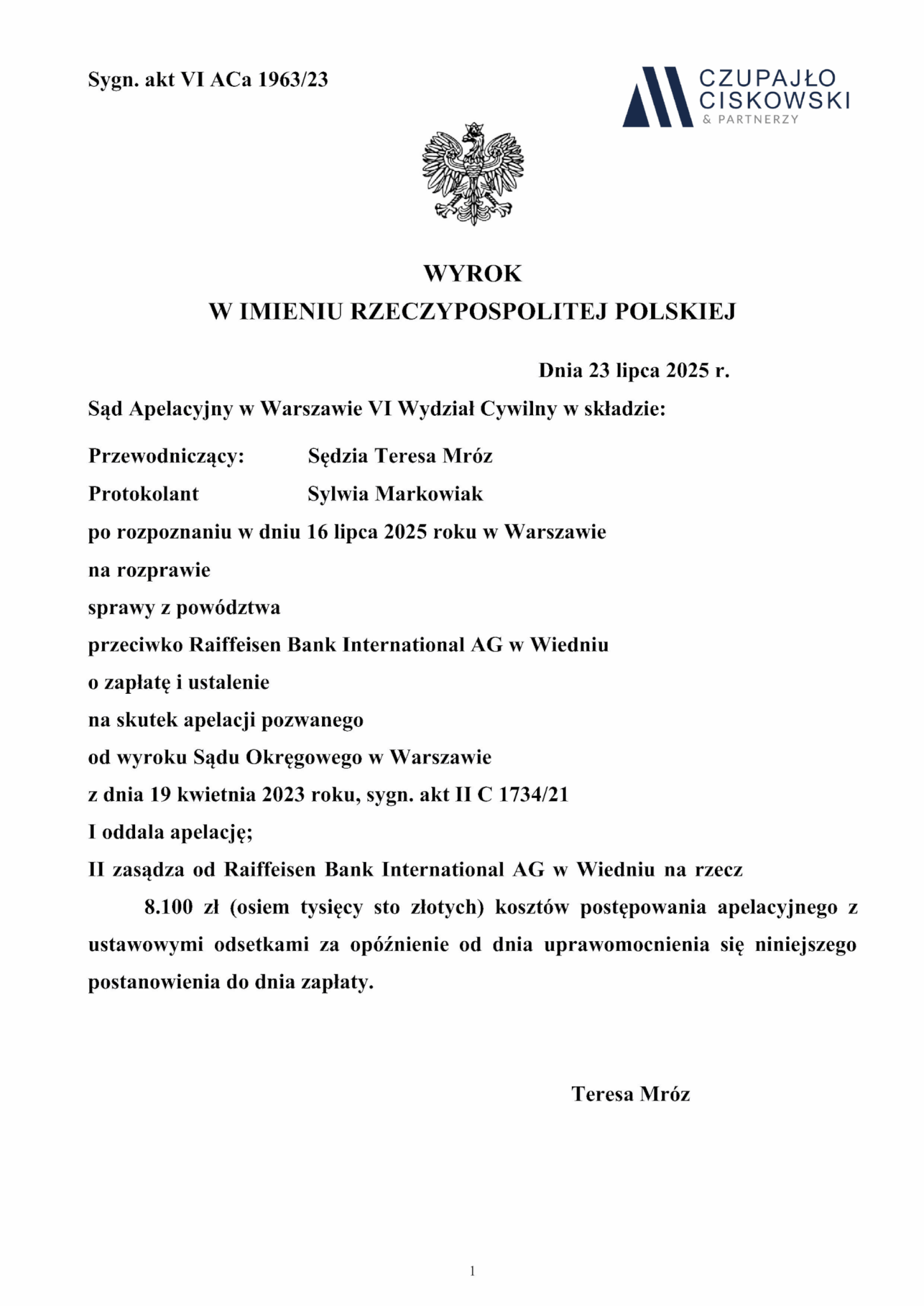 Sąd Apelacyjny w Warszawie, VI Wydział Cywilny w składzie SSA Teresa Mróz wyrokiem z dnia 23 lipca 2025 r. w sprawie z powództwa naszej Klientki przeciwko Raiffeisen Bank International AG prowadzonej pod sygn. akt VI ACa 1963/23 oddalił apelację banku od wyroku Sądu Okręgowego w Warszawie z dnia 19 kwietnia 2023 r. sygn. akt II C 1734/21 w którym Sąd unieważnił umowę kredytu łączącą naszą Klientkę z bankiem oraz zasądził na jej rzecz kwotę 303 297,75 zł wraz z odsetkami za opóźnienie od 8 marca 2020 r., tj. od wezwania banku do zapłaty, a także od 30 września 2021 r., tj. od doręczania bankowi odpisu pozwu.