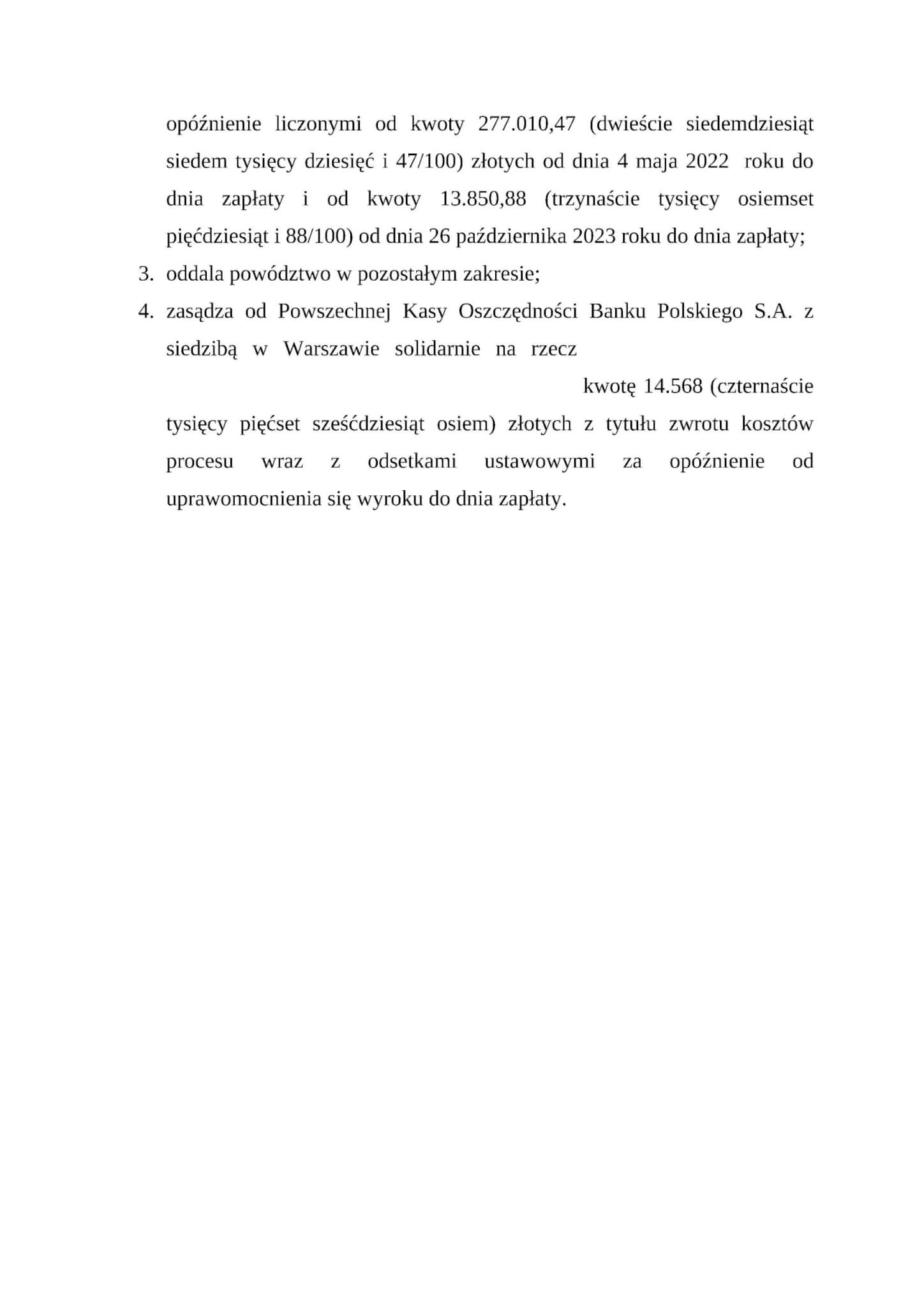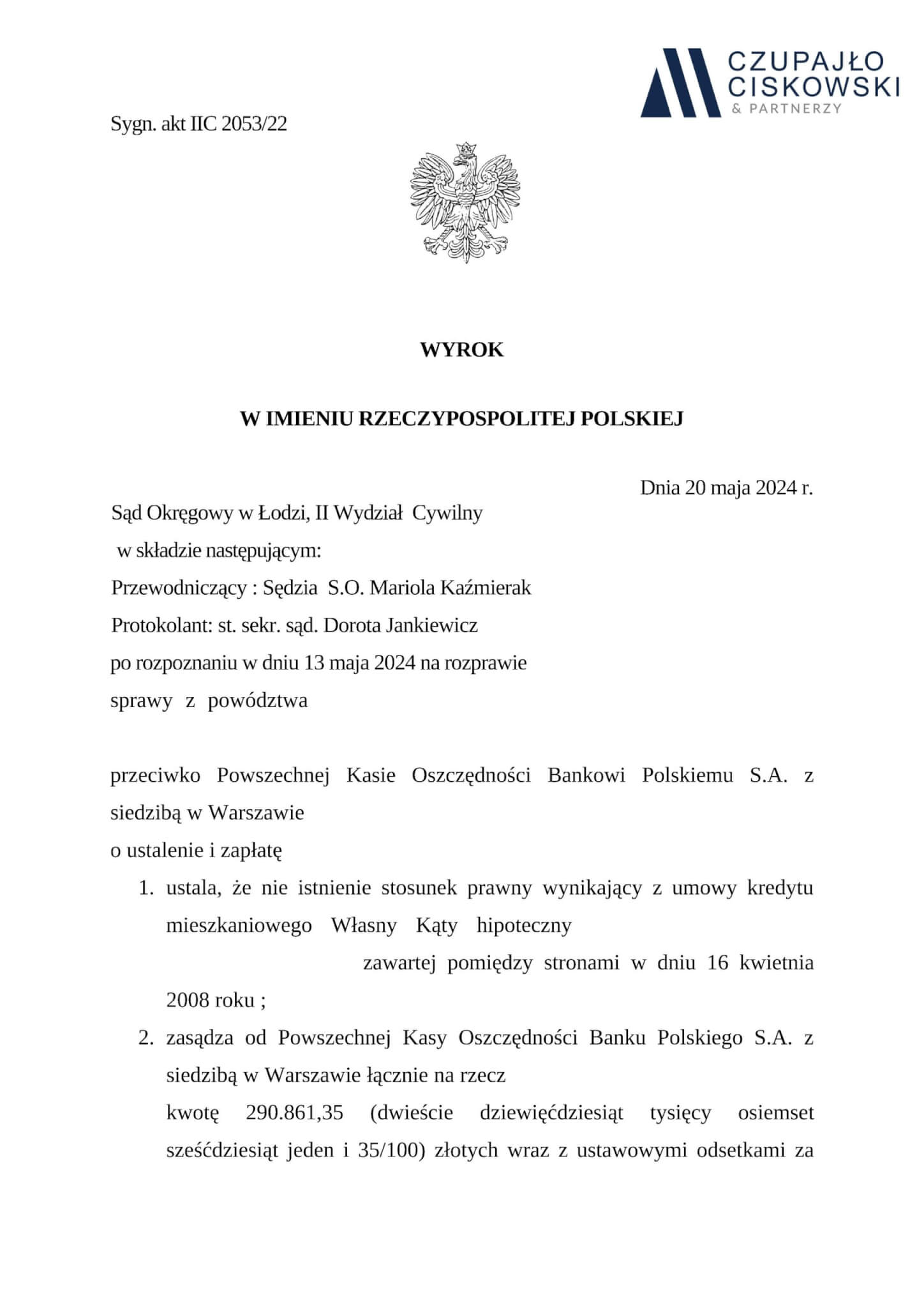 Sąd Okręgowy w Łodzi, II Wydział Cywilny w składzie sędzia Mariola Kaźmierak wyrokiem z dnia 20 maja 2024 r. w sprawie przeciwko Powszechnej Kasie Oszczędności Bankowi Polskiemu z siedzibą w Warszawie prowadzonej pod sygn. akt II C 2053/22 ustalił, nieistnienie stosunku prawnego wynikającego z umowy kredytu, łączącego naszych Klientów z bankiem. Ponadto zasądził na rzecz naszych Klientów kwotę 290.861,35 PLN wraz z odsetkami ustawowymi za opóźnienie liczonymi od kwoty 277.010,47 PLN od dnia wskazanego w reklamacji wraz z wezwaniem do zapłaty, zaś od kwoty 13 850,88 PLN od dnia wskazanego w modyfikacji powództwa.