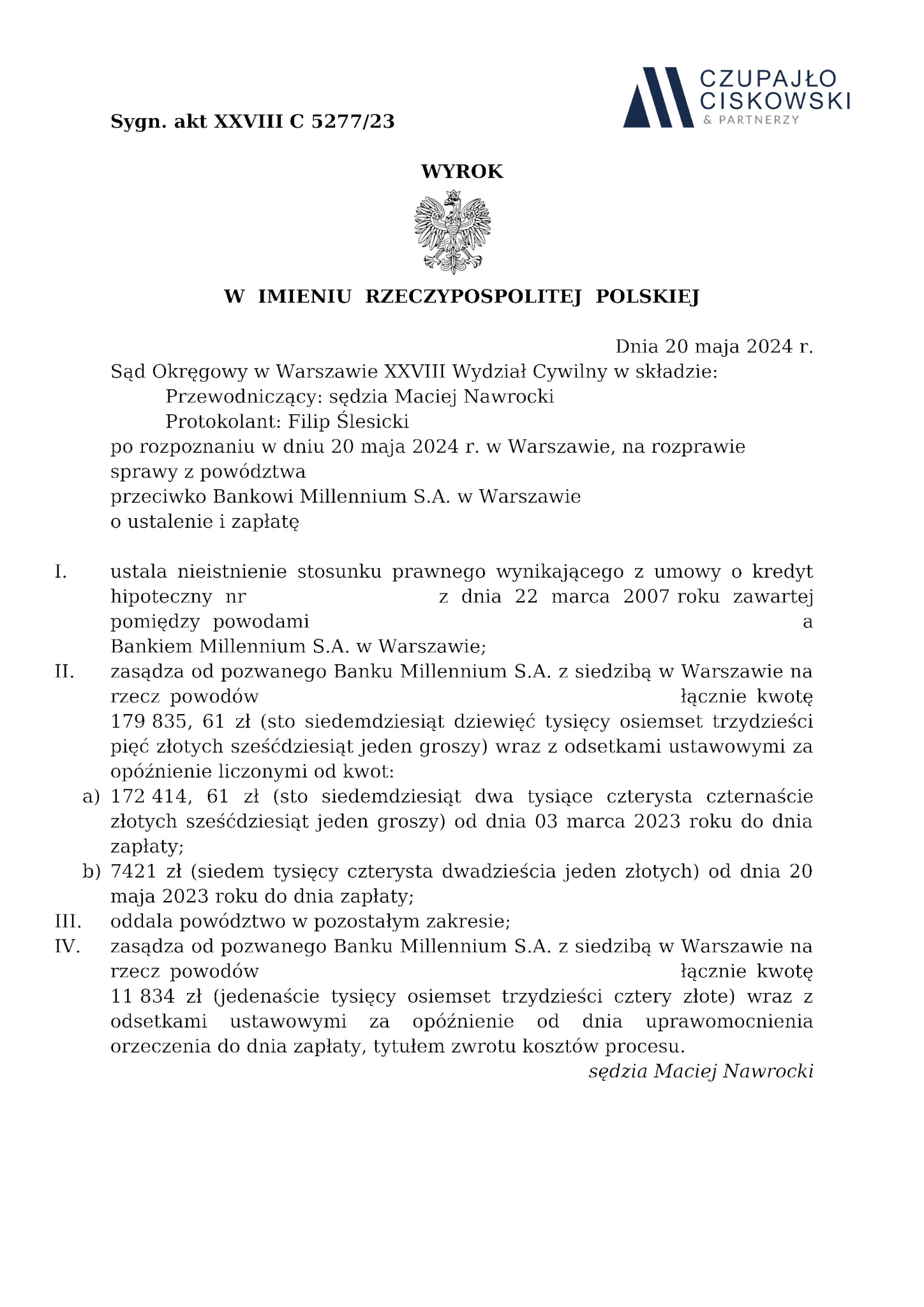 Sąd Okręgowy w Warszawie, XXVIII Wydział Cywilny w składzie sędzia Maciej Nawrocki wyrokiem z dnia 20 maja 2024 r. w sprawie przeciwko Bankowi Millennium S.A z siedzibą w Warszawie prowadzonej pod sygn. akt XXVIII C 5277/23 ustalił, że umowa kredytu hipotecznego łącząca naszych Klientów z bankiem jest nieważna. Ponadto zasądził na rzecz naszych Klientów kwotę 179 835, 61 PLN wraz z odsetkami ustawowymi od dnia następującego po doręczeniu reklamacji z wezwaniem do zapłaty.