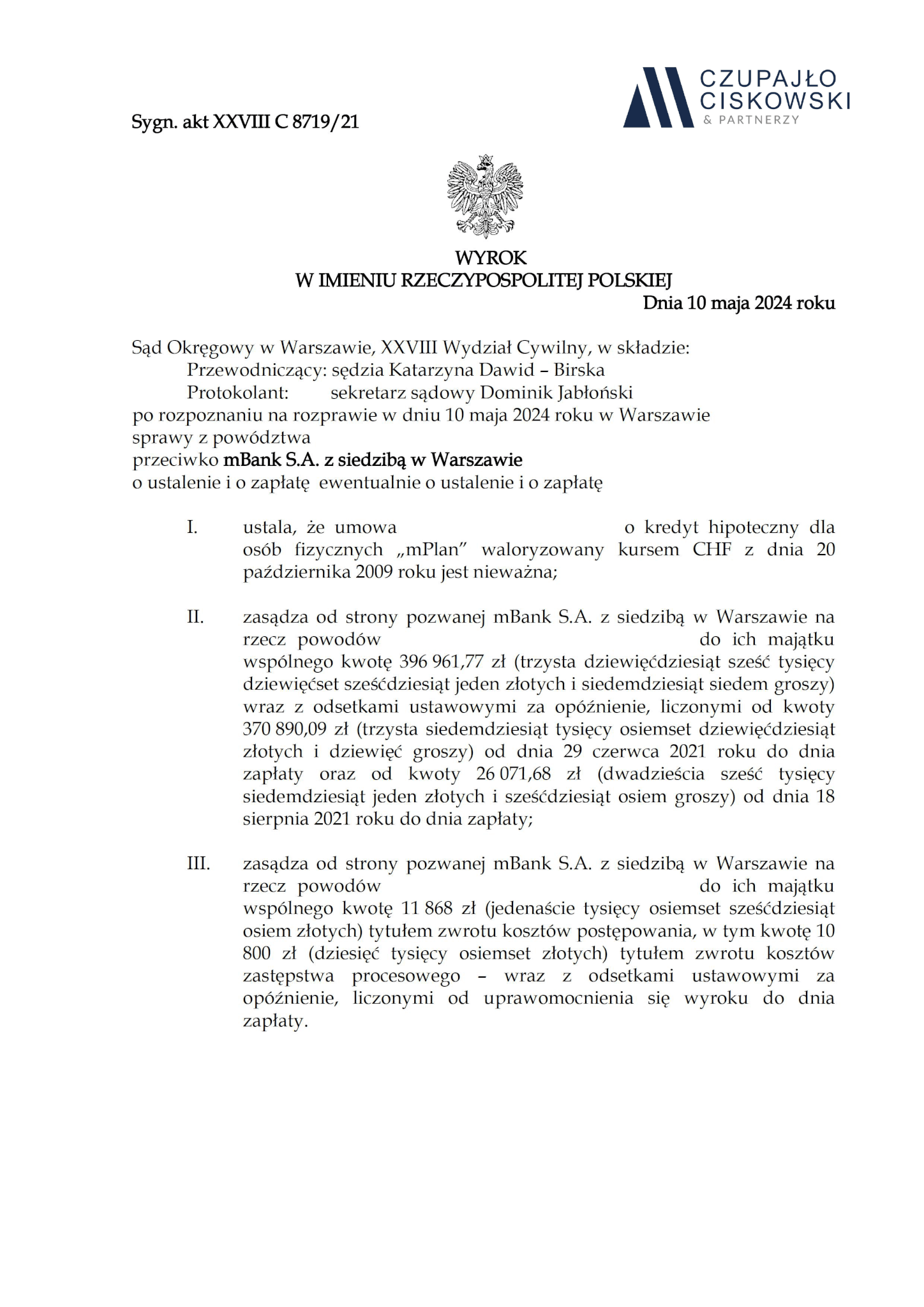 Sąd Okręgowy w Warszawie, XXVIII Wydział Cywilny w składzie sędzia Katarzyna Dawid-Birska wyrokiem z dnia 10 maja 2024 r. w sprawie przeciwko mBank S.A. prowadzonej pod sygn. akt XXVIII C 8719/21 ustalił, że umowa kredytu hipotecznego łącząca naszych Klientów z bankiem jest nieważna. Ponadto zasądził na rzecz naszych Klientów kwotę 370 890,09 PLN wraz z odsetkami ustawowymi od dnia wskazanego w wezwaniu do zapłaty oraz kwotę 26 071,68 PLN wraz z odsetkami ustawowymi od dnia następującego po otrzymaniu przez Pozwanego odpisu pozwu.