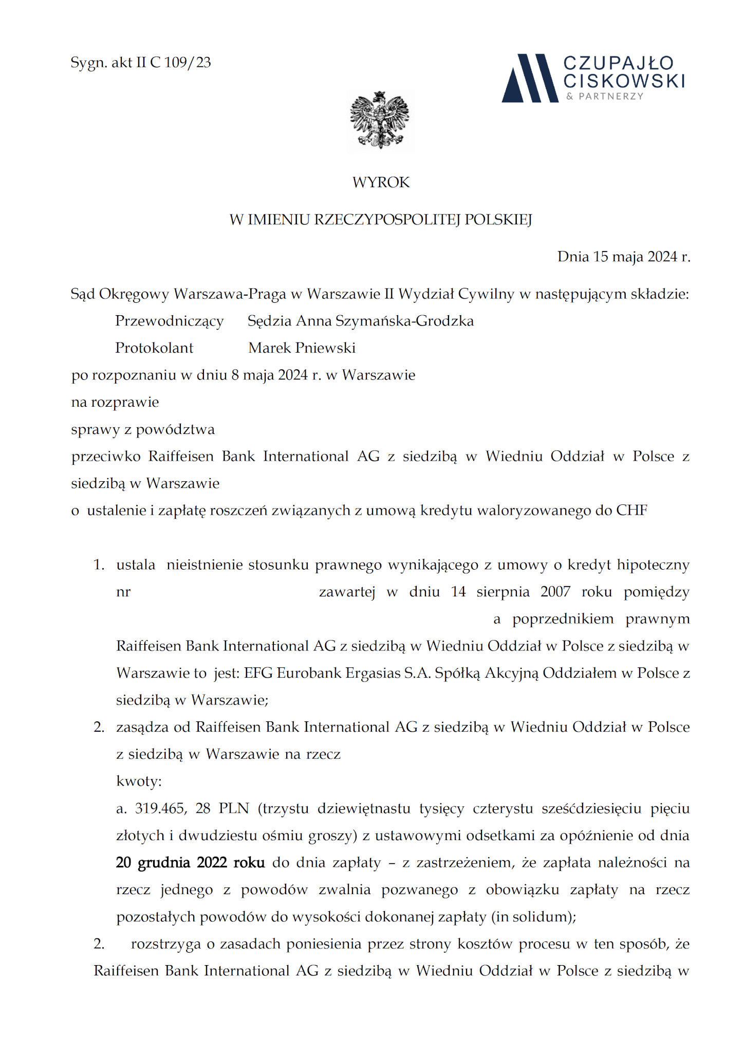 Sąd Okręgowy Warszawa-Praga w Warszawie, II Wydział Cywilny w składzie sędzia Anna Szymańska-Grodzka wyrokiem z dnia 15 maja 2024 r. w sprawie przeciwko Raiffeisen Bank International AG z siedzibą w Wiedniu Oddział w Polsce z siedzibą w Warszawie prowadzonej pod sygn. akt II C 109/23 ustalił, że umowa kredytu hipotecznego łącząca naszych Klientów z bankiem jest nieważna. Ponadto zasądził na rzecz naszych Klientów kwotę 319 465,28 PLN wraz z odsetkami ustawowymi od dnia wskazanego w wezwaniu do zapłaty.