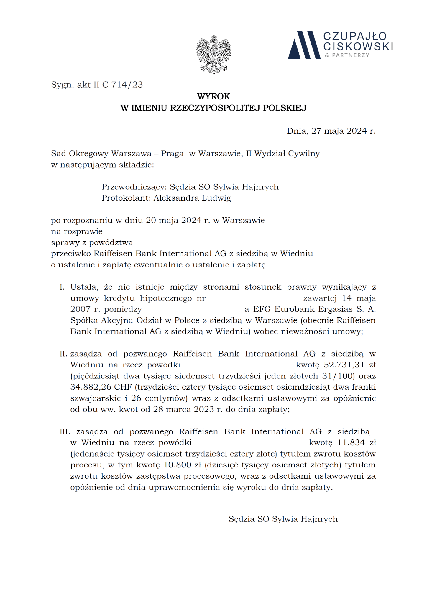Sąd Okręgowy warszawa-Praga w Warszawie, II Wydział Cywilny w składzie sędzia Sylwia Hajnrych wyrokiem z dnia 27 maja 2024 r. w sprawie przeciwko Raiffeisen Bank International AG z siedzibą w Wiedniu Oddział w Polsce z siedzibą w Warszawie prowadzonej pod sygn. akt II C 714/23 ustalił, że umowa kredytu hipotecznego łącząca naszych Klientów z bankiem jest nieważna. Ponadto zasądził na rzecz naszej Klientki kwotę 52 731,31 PLN oraz 34 882,26 CHF wraz z odsetkami ustawowymi od wezwania Banku do zapłaty.