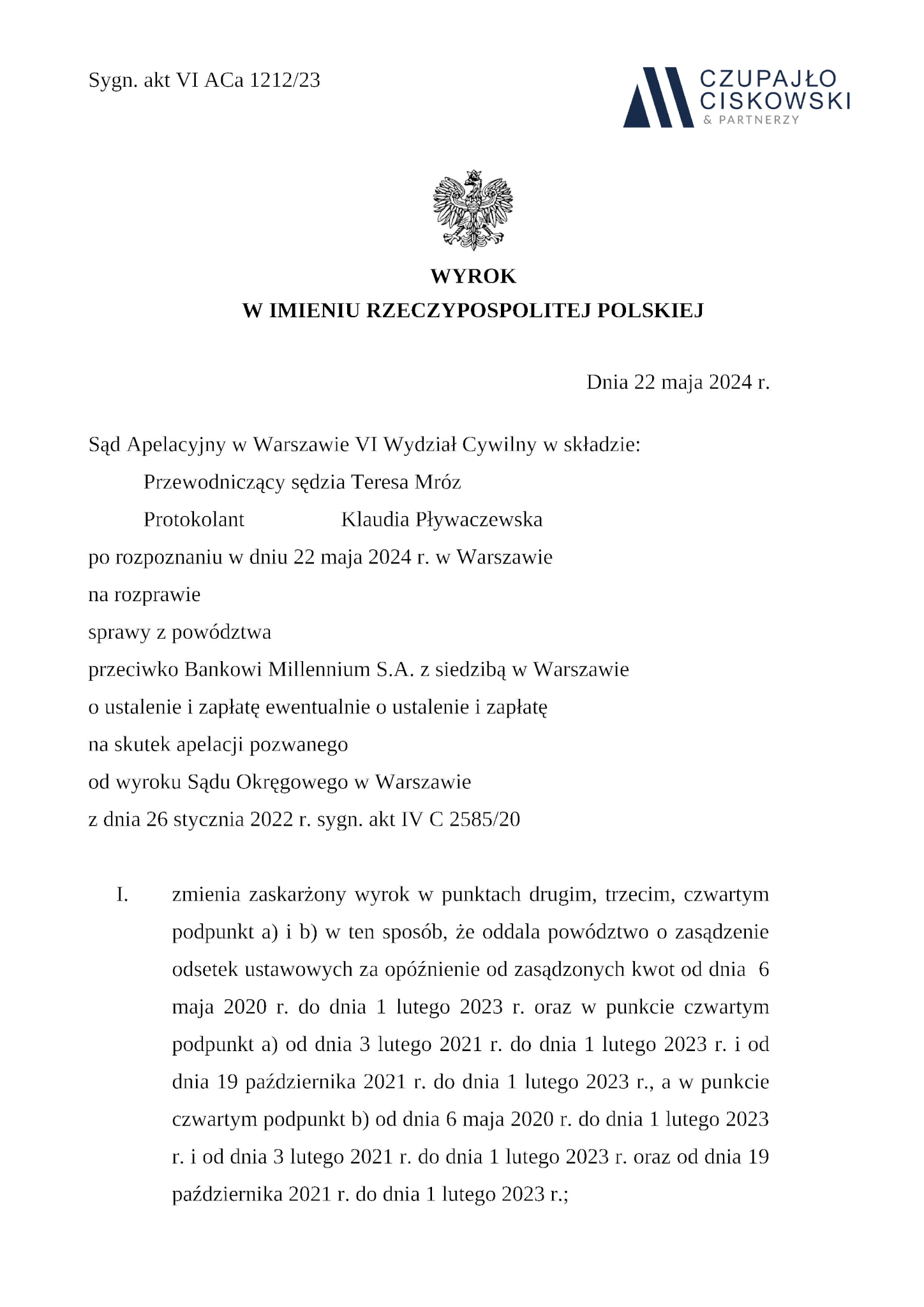 Sąd Apelacyjny w Warszawie, VI Wydział Cywilny w składzie sędzia Teresa mróz wyrokiem z dnia 22 maja 2024 r. w sprawie przeciwko Bankowi Millennium S.A. z siedzibą w Warszawie, prowadzonej pod sygn. akt VI ACa 1212/23 zmienił wyrok Sądu Okręgowego (sygn. akt IV C 2585/20) utrzymał wyrok sądu I instancji unieważniający umowę kredytu zawartą przez naszych klientów z bankiem oraz oddalił powództwo o zasądzenie odsetek ustawowych za opóźnienie od zasądzonych kwot w zaskarżonym wyroku w punktach drugim, trzecim oraz czwartym Sąd zasądził także na rzecz powodów kwotę 8 100 PLN wraz z odsetkami za opóźnienie od uprawomocnienia się orzeczenia.