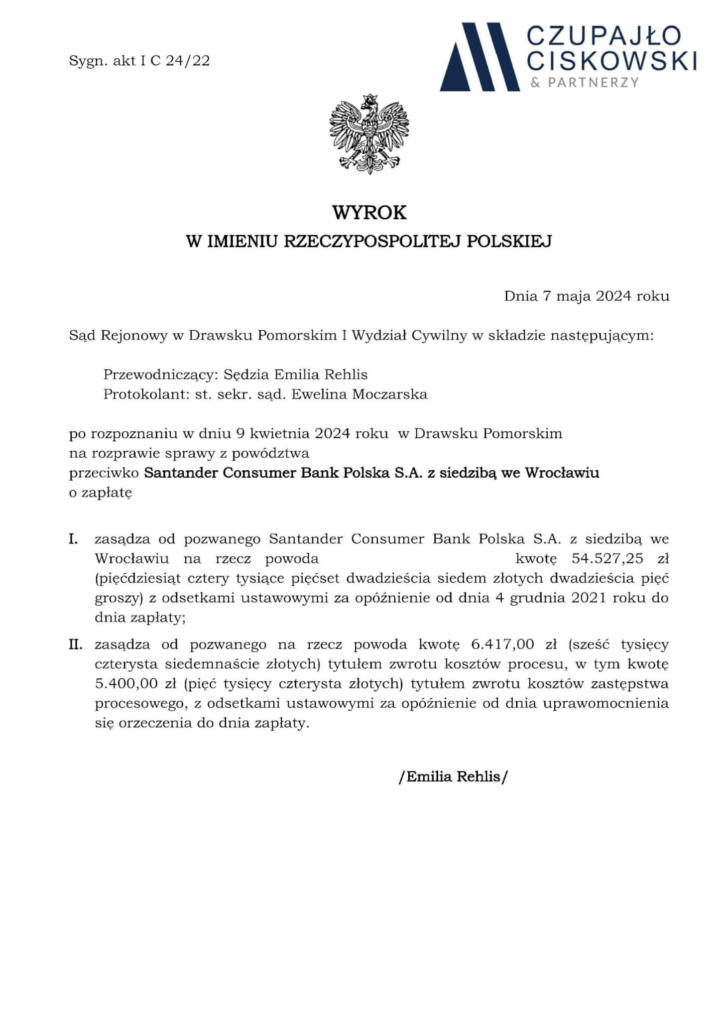 Sąd Rejonowy w Drawsku Pomorskim, I Wydział Cywilny w składzie SSR Emilia Rehlis wyrokiem z dnia 7 maja 2024 w sprawie przeciwko Santander Consumer Bank S.A. prowadzonej pod sygn. akt I C 24/22 przesłankowo stwierdził nieważność umowy kredytu hipotecznego łączącej naszego Klienta z bankiem Ponadto zasądził na rzecz naszego Klienta kwotę 54 527,25 PLN wraz z odsetkami ustawowymi za opóźnienie liczonymi od dnia doręczenia bankowi reklamacji wraz z wezwaniem do zapłaty.