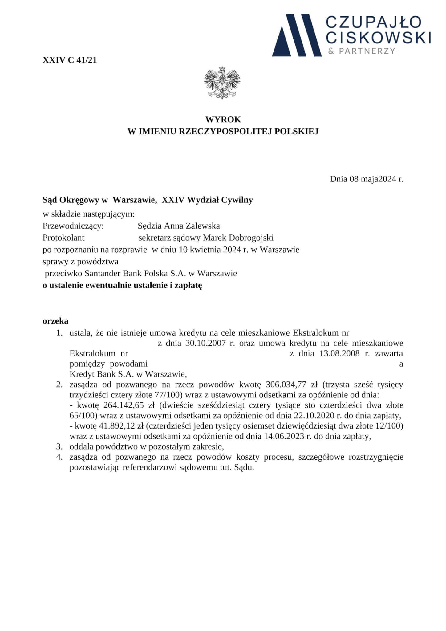 Sąd Okręgowy w Warszawie, XXIV Wydział Cywilny w składzie SSO Anna Zalewska wyrokiem z dnia 8 maja 2024 r. w sprawie przeciwko Santander Bank Polska S.A. prowadzonej pod sygn. akt XXIV C 41/21 ustalił, że umowa kredytu hipotecznego łącząca naszych Klientów z bankiem jest nieważna. Ponadto zasądził na rzecz naszych Klientów kwotę 264 142,65 PLN wraz z odsetkami ustawowymi za opóźnienie liczonymi od dnia doręczenia bankowi reklamacji wraz z wezwaniem do zapłaty oraz kwotę 41 892, 12 PLN wraz z odsetkami ustawowymi za opóźnienie od dnia modyfikacji powództwa.