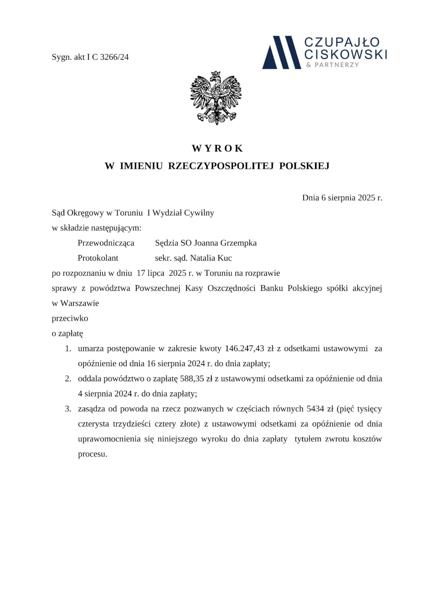 Sąd Okręgowy w Toruniu I Wydział Cywilny w składzie sędzia Joanna Grzempka wyrokiem z dnia 6 sierpnia 2025 roku w sprawie z powództwa Powszechnej Kasy Oszczędności Banku Polskiego spółki akcyjnej w Warszawie przeciwko naszym klientom prowadzonej pod sygn. akt I C 3266/24 umorzyła postępowanie oraz oddaliła powództwo banku.