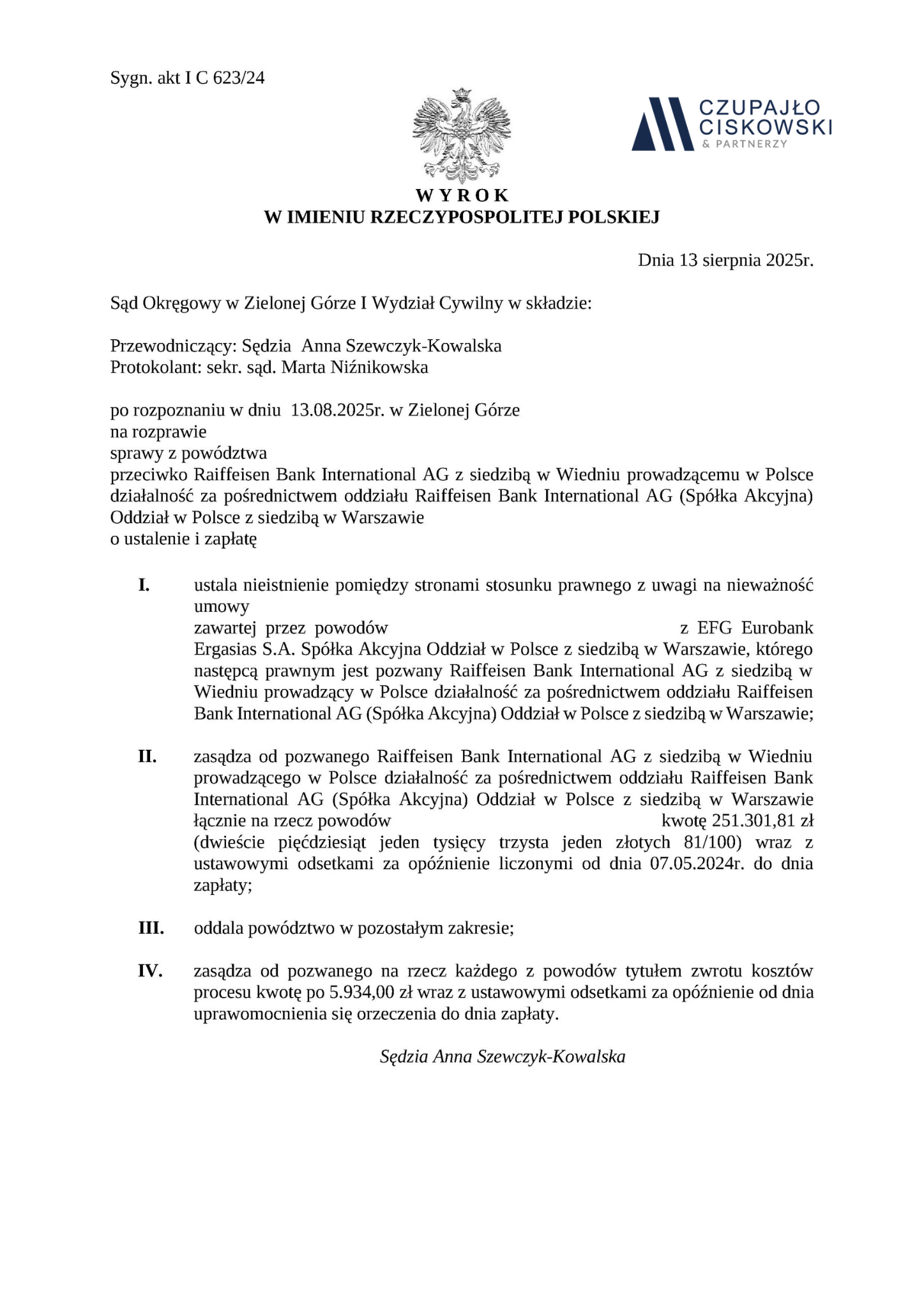 Sąd Okręgowy w Zielonej Górze, I Wydział Cywilny w składzie SSO Anna Szewczyk -Kowalska wyrokiem z dnia 13 sierpnia 2025 r. w sprawie przeciwko Raiffeisen Bank International AG działający przez: Raiffeisen Bank International AG (Spółka Akcyjna) Oddział w Polsce prowadzonej pod sygn. akt I C 623/24 ustalił, że umowa kredytu hipotecznego łącząca naszych Klientów z bankiem jest nieważna. Ponadto zasądził na rzecz naszych Klientów kwotę 251 301,81 PLN wraz z odsetkami ustawowymi za opóźnienie od upływu terminu zakreślonego w wezwaniu do zapłaty.