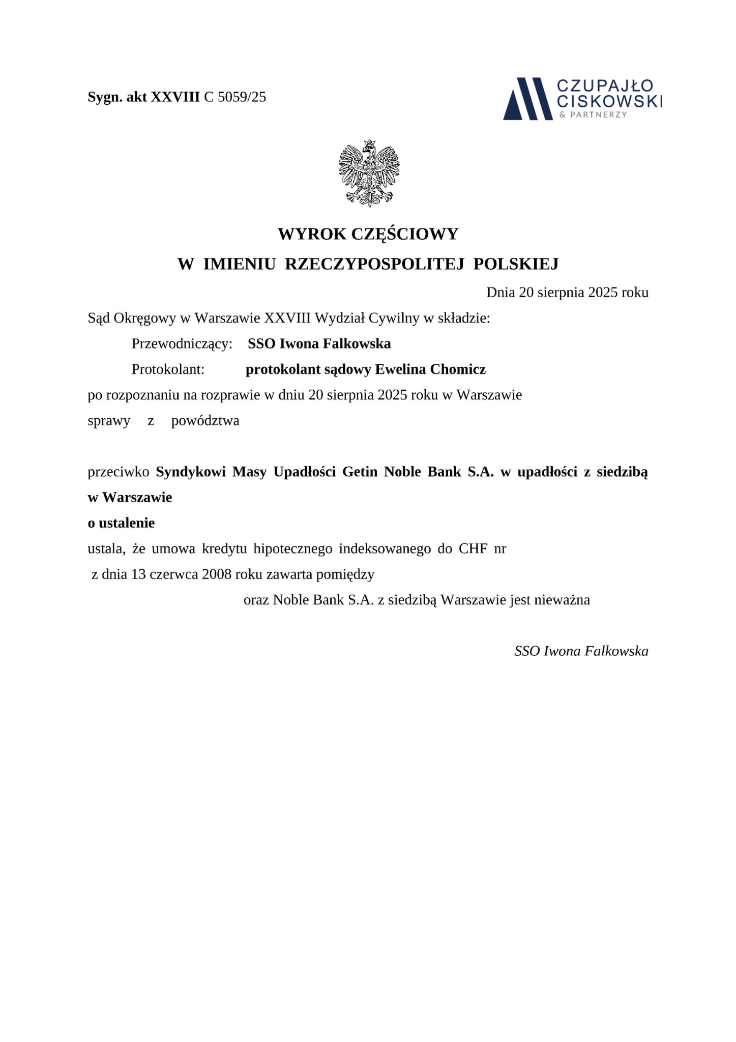 Sąd Okręgowy w Warszawie XXVIII Wydział Cywilny w składzie sędzia Iwona Falkowska wyrokiem z dnia 20 sierpnia 2025 r. w sprawie przeciwko Syndykowi Masy Upadłości Getin Noble Bank S.A. w upadłości z siedzibą w Warszawie prowadzonej pod sygn. akt XXVIII C 5059/25 ustalił, że umowa kredytu hipotecznego łącząca naszych Klientów z bankiem jest nieważna.