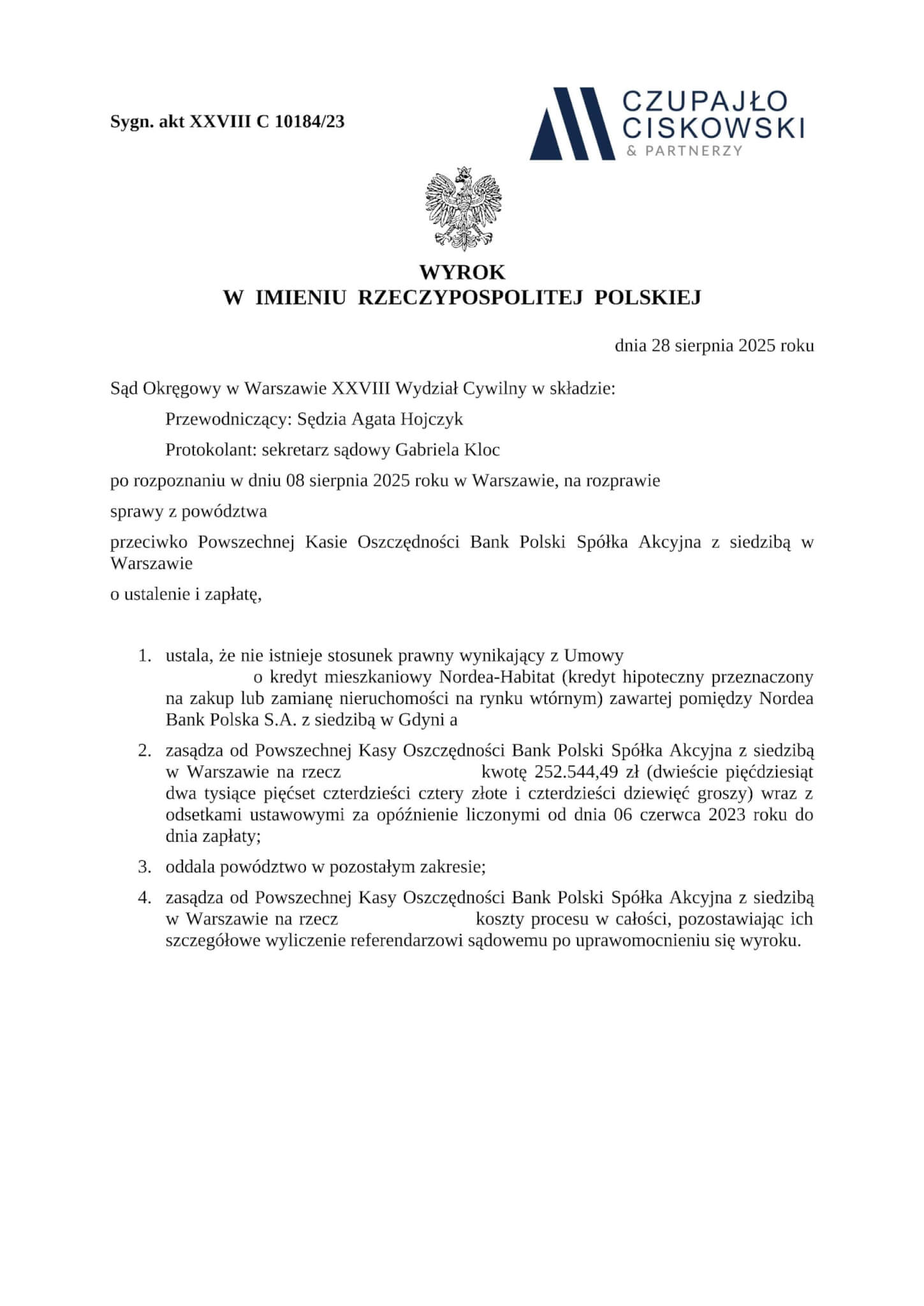 Sąd Okręgowy w Warszawie XXVIII Wydział Cywilny w składzie sędzia Agata Hojczyk wyrokiem z dnia 28 sierpnia 2025 roku w sprawie przeciwko Powszechnej Kasie Oszczędności Bank Polski Spółka Akcyjna z siedzibą w Warszawie prowadzonej pod sygn. akt XXVIII C 10184/23 ustaliła, że umowa kredytu hipotecznego łącząca naszą Klientkę z bankiem jest nieważna.
