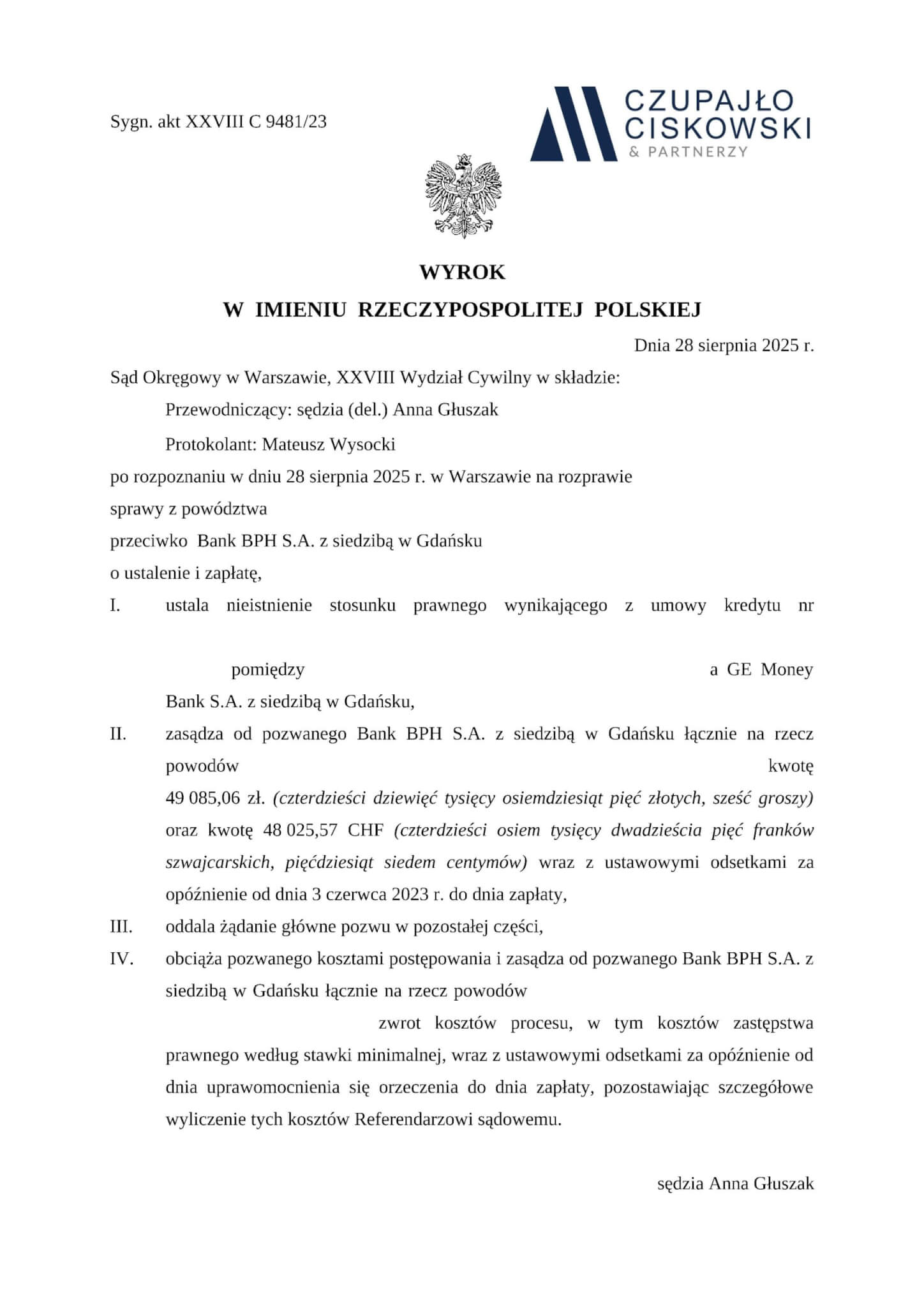 Sąd Okręgowy w Warszawie XXVIII Wydział Cywilny w składzie sędzia Anna Głuszak wyrokiem z dnia 28 sierpnia 2025 roku w sprawie przeciwko Bankowi BPH S.A. z siedzibą w Gdańsku prowadzonej pod sygn. akt XXVIII C 9481/23 ustaliła, że umowa kredytu hipotecznego łącząca naszych Klientów z bankiem jest nieważna.