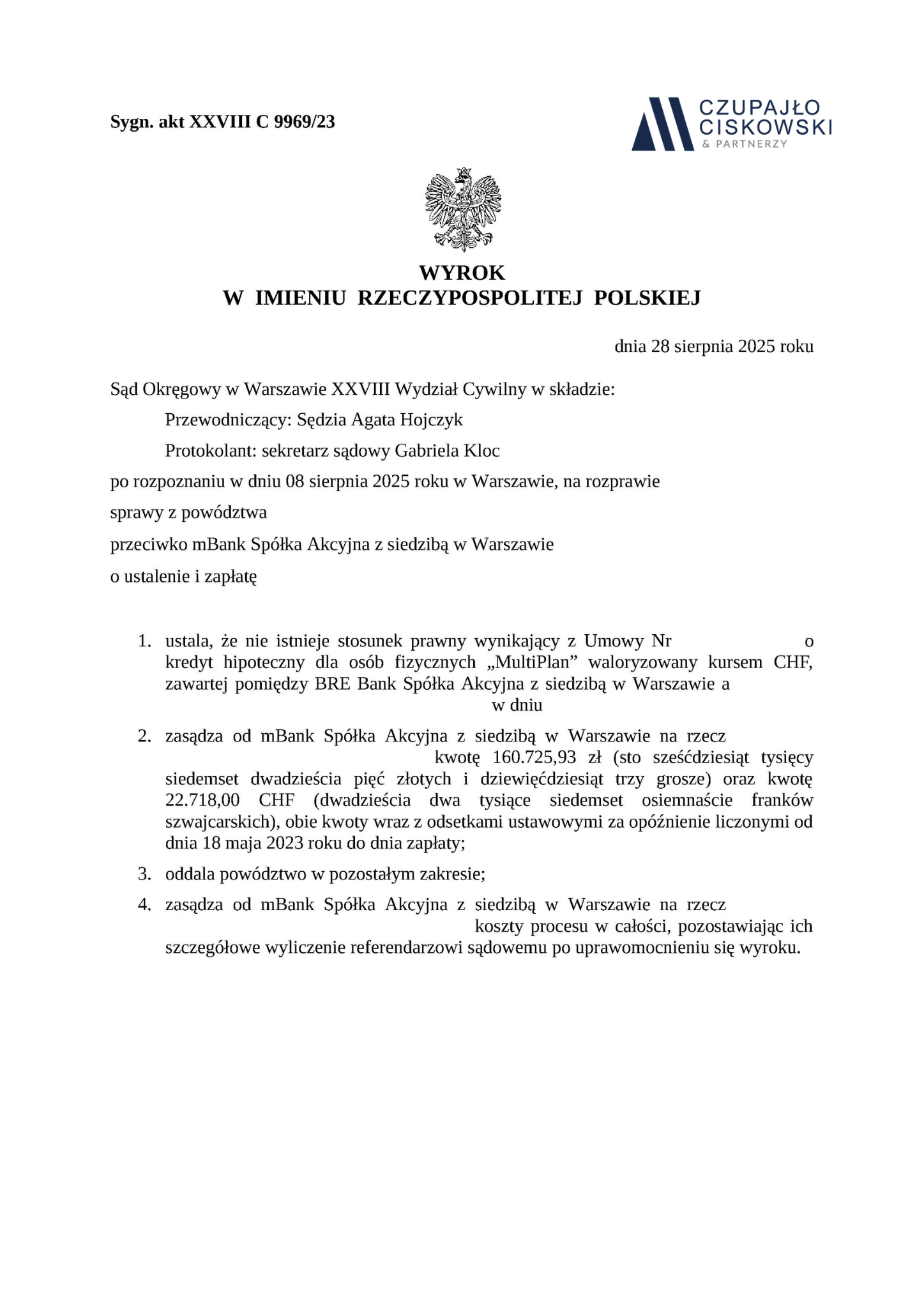 Sąd Okręgowy w Warszawie, XXVIII Wydział Cywilny w składzie SSO Agata Hojczyk wyrokiem z dnia 28 sierpnia 2025 r. w sprawie przeciwko mBank S.A. z siedzibą w Warszawie prowadzonej pod sygn. akt XXVIII C 9969/23 ustalił, że umowa kredytu hipotecznego łącząca naszych Klientów z bankiem jest nieważna. Ponadto zasądził na rzecz naszych Klientów kwotę 160 725,93 PLN oraz 22 718,00 CHF wraz z odsetkami ustawowymi od upływu terminu zakreślonego w wezwaniu do zapłaty.