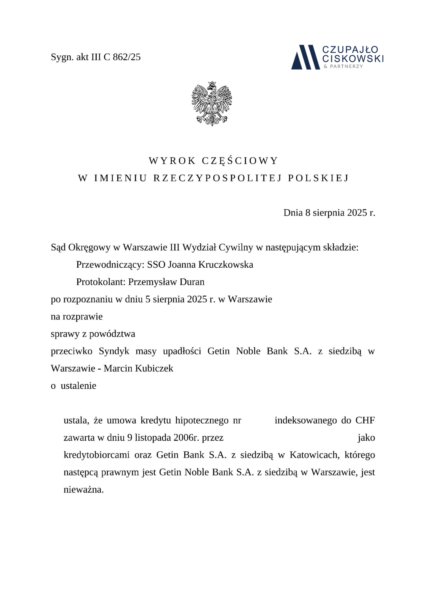 Sąd Okręgowy w Warszawie III Wydział Cywilny w składzie sędzia Joanna Kruczkowska wyrokiem z dnia 8 sierpnia 2025 roku w sprawie przeciwko Syndykowi Masy Upadłości Getin Noble Bank S.A. w upadłości z siedzibą w Warszawie prowadzonej pod sygn. akt III C 862/25 ustaliła, że umowa kredytu hipotecznego łącząca naszego Klienta z bankiem jest nieważna.