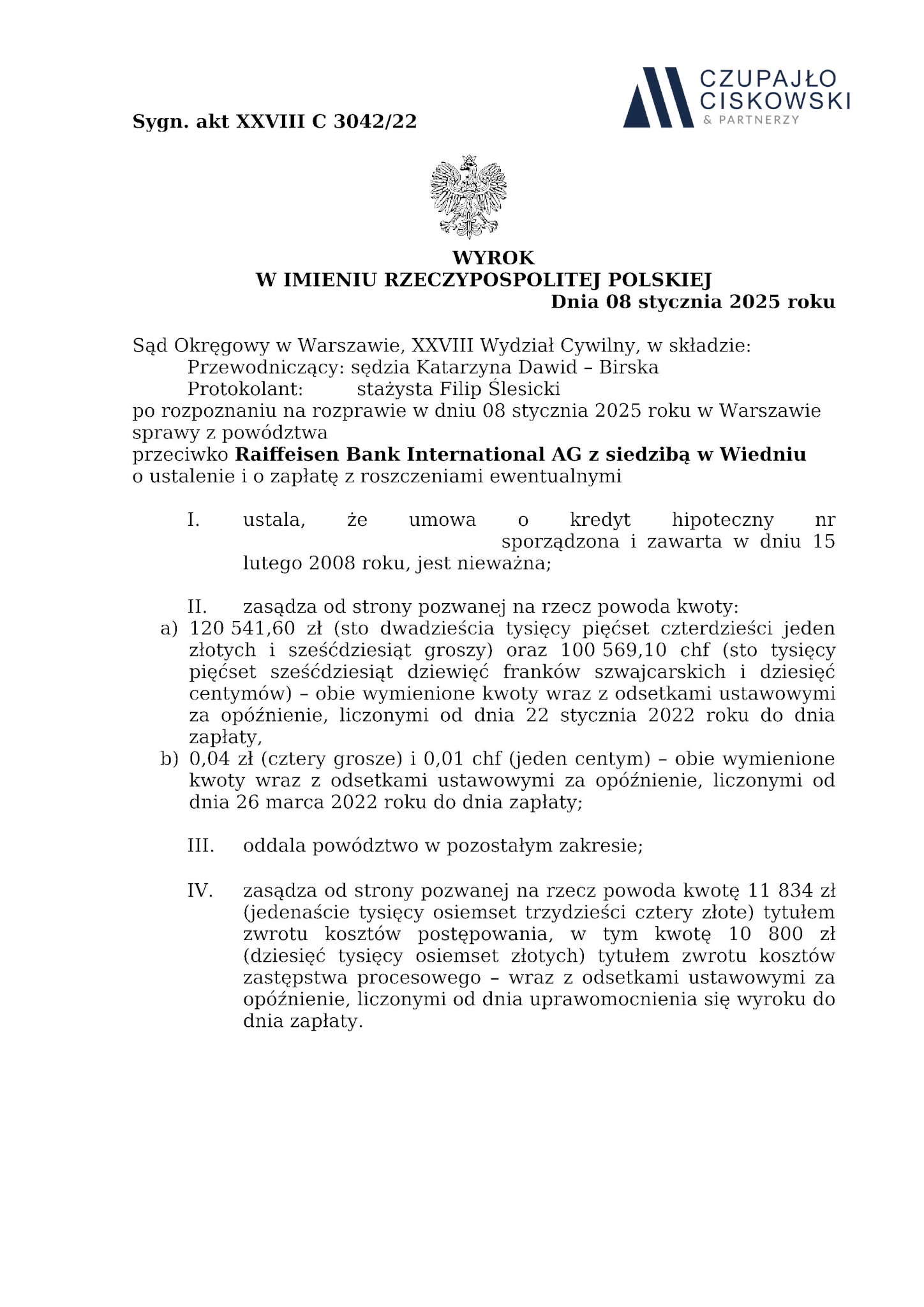 Sąd Okręgowy w Warszawie, XXVIII Wydział Cywilny w składzie Katarzyna Dawid-Birska wyrokiem z dnia 8 stycznia 2025 r. w sprawie przeciwko Raiffeisen Bank International AG działający przez Raiffeisen Bank International AG (Spółka Akcyjna) Oddział w Polsce prowadzonej pod sygn. akt XXVIII C 3042/22 ustalił, że umowa kredytu hipotecznego łącząca naszych Klientów z bankiem jest nieważna. Ponadto zasądził na rzecz naszych Klientów kwotę 120 541,60 PLN oraz 100 569,10 CHF wraz z odsetkami ustawowymi od dnia wskazanego w wezwaniu do zapłaty.