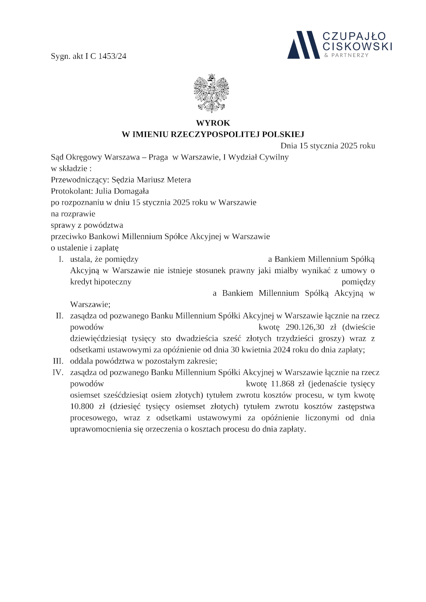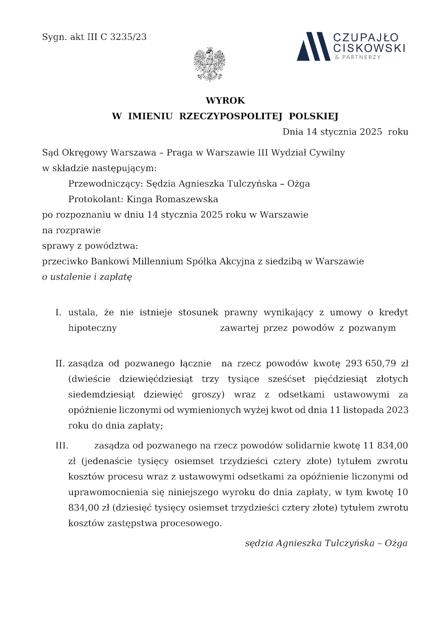 Sąd Okręgowy Warszawa-Praga w Warszawie, III Wydział Cywilny w składzie Sędzia Agnieszka Tulczyńska-Ożga wyrokiem z dnia 14 stycznia 2025 r. w sprawie przeciwko Bankowi Millennium S.A. z siedzibą w Warszawie prowadzonej pod sygn. akt III C 3235/23 ustalił, że umowa kredytu hipotecznego łącząca naszych Klientów z bankiem jest nieważna. Ponadto zasądził na rzecz naszych Klientów kwotę 293 650,79 PLN wraz z odsetkami ustawowymi od dnia wskazanego w wezwaniu do zapłaty.