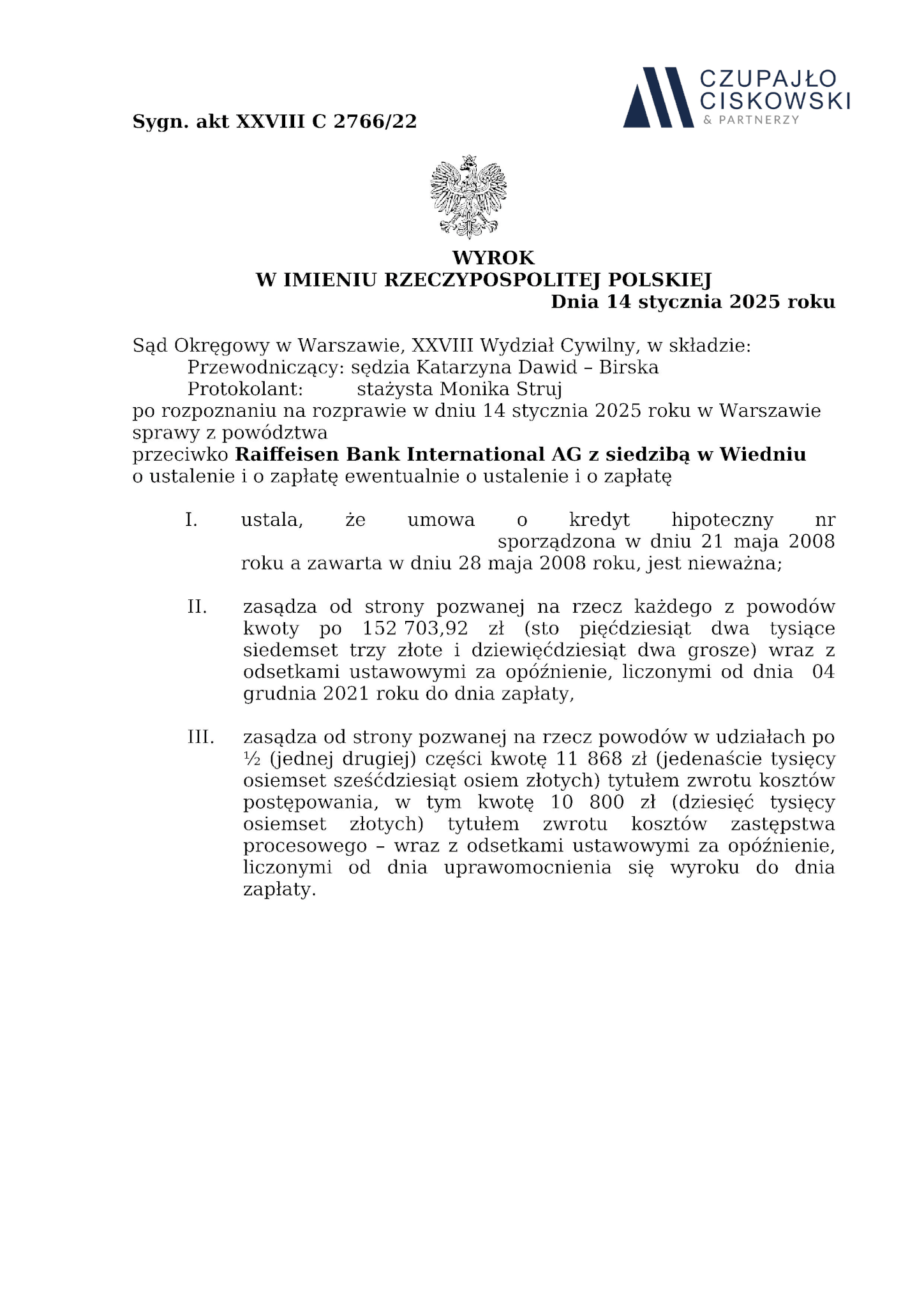 Sąd Okręgowy w Warszawie, XXVIII Wydział Cywilny w składzie SSO Katarzyna Dawid-Birska wyrokiem z dnia 14 stycznia 2025 r. w sprawie przeciwko Raiffeisen Bank International AG działający przez Raiffeisen Bank International AG (Spółka Akcyjna) Oddział w Polsce prowadzonej pod sygn. akt XXVIII C 2766/22 ustalił, że umowa kredytu hipotecznego łącząca naszych Klientów z bankiem jest nieważna. Ponadto zasądził na rzecz naszych Klientów kwotę 152 703,92 PLN wraz z odsetkami ustawowymi od dnia wskazanego w wezwaniu do zapłaty.