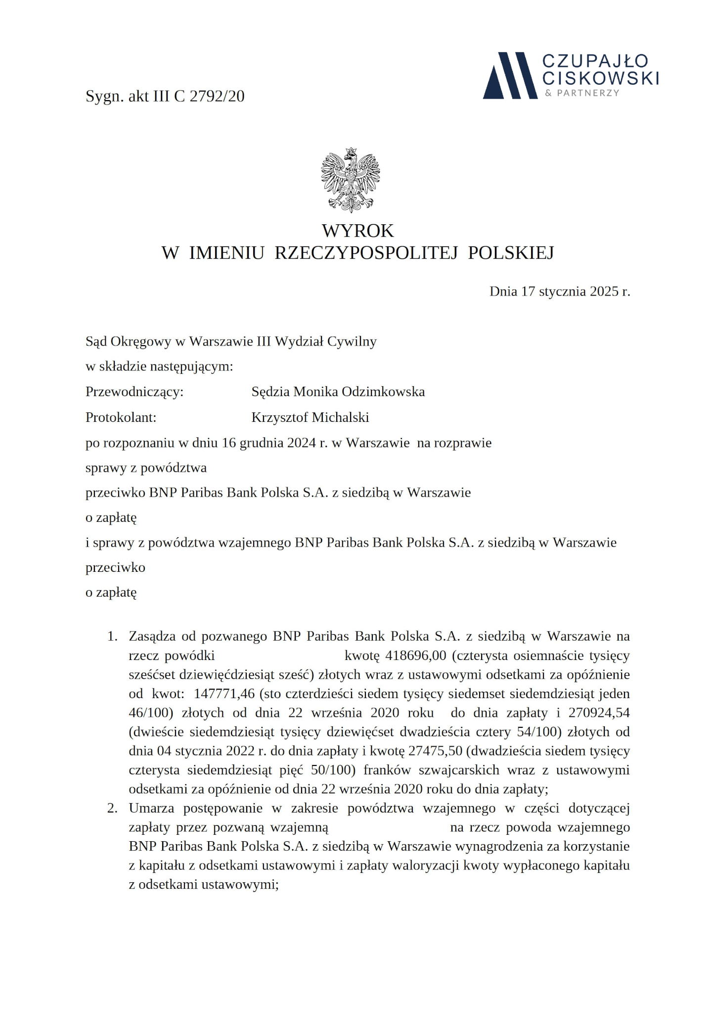 Sąd Okręgowy w Warszawie, III Wydział Cywilny w składzie Sędzia Monika Odzimkowska wyrokiem z dnia 17 stycznia 2025 r. w sprawie przeciwko BNP Paribas Bank Polska S.A. z siedzibą w Warszawie prowadzonej pod sygn. akt III C 2792/20 zasądził na rzecz naszej Klientki kwotę 418696,00 zł wraz z odsetkami ustawowymi za opóźnienia.