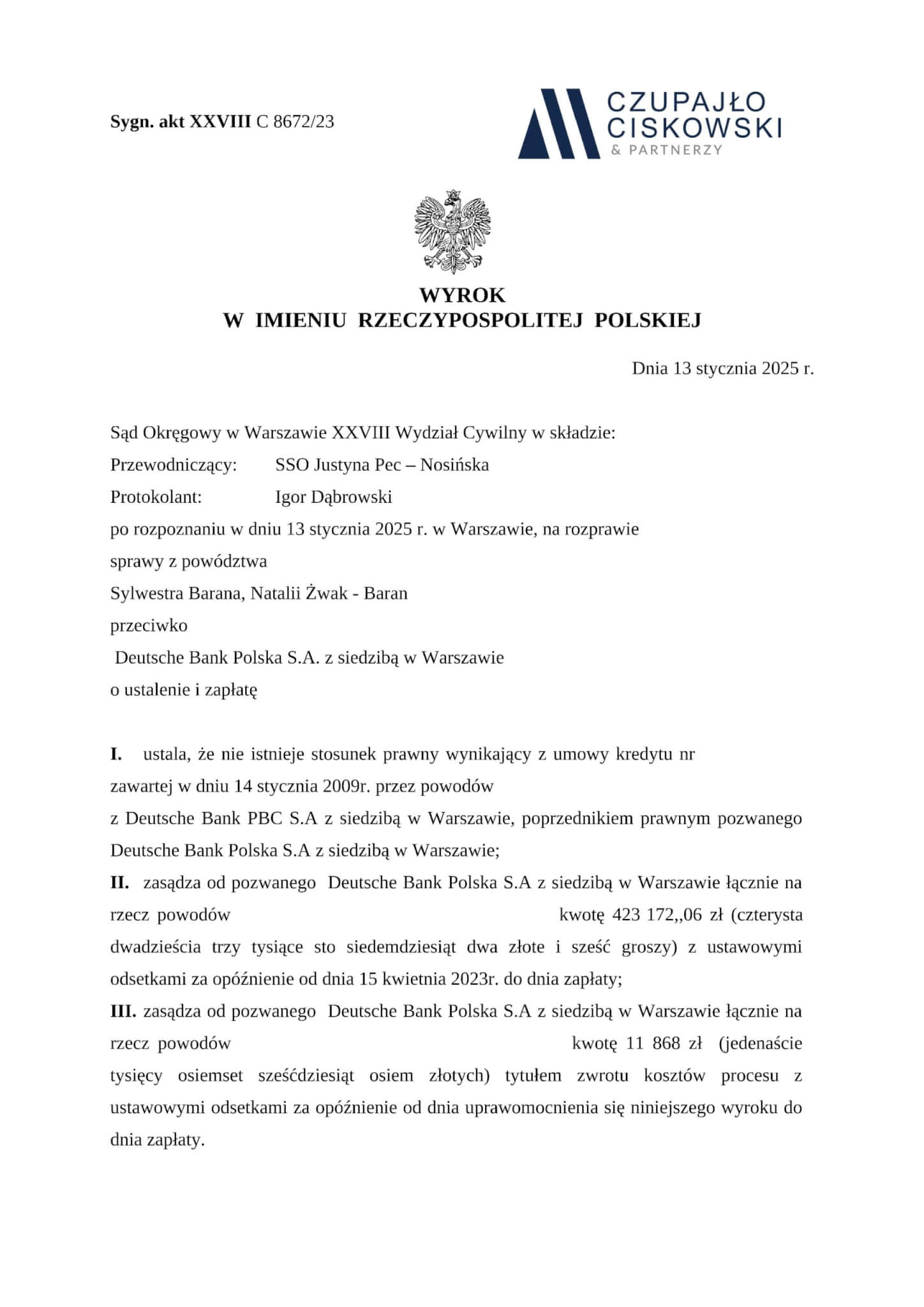 Sąd Okręgowy w Warszawie, XXVIII Wydział Cywilny w składzie SSO Justyny Pec-Nosińskiej wyrokiem z dnia 13 stycznia 2025 r. w sprawie przeciwko Deutsche Bank Polska S.A. z siedzibą w Warszawie prowadzonej pod sygn. akt XXVIII C 8672/23 ustalił, że umowa kredytu hipotecznego łącząca naszych Klientów z bankiem jest nieważna. Ponadto zasądził na rzecz naszych Klientów kwotę 423 172,06 PLN wraz z odsetkami ustawowymi od dnia wskazanego w wezwaniu do zapłaty.