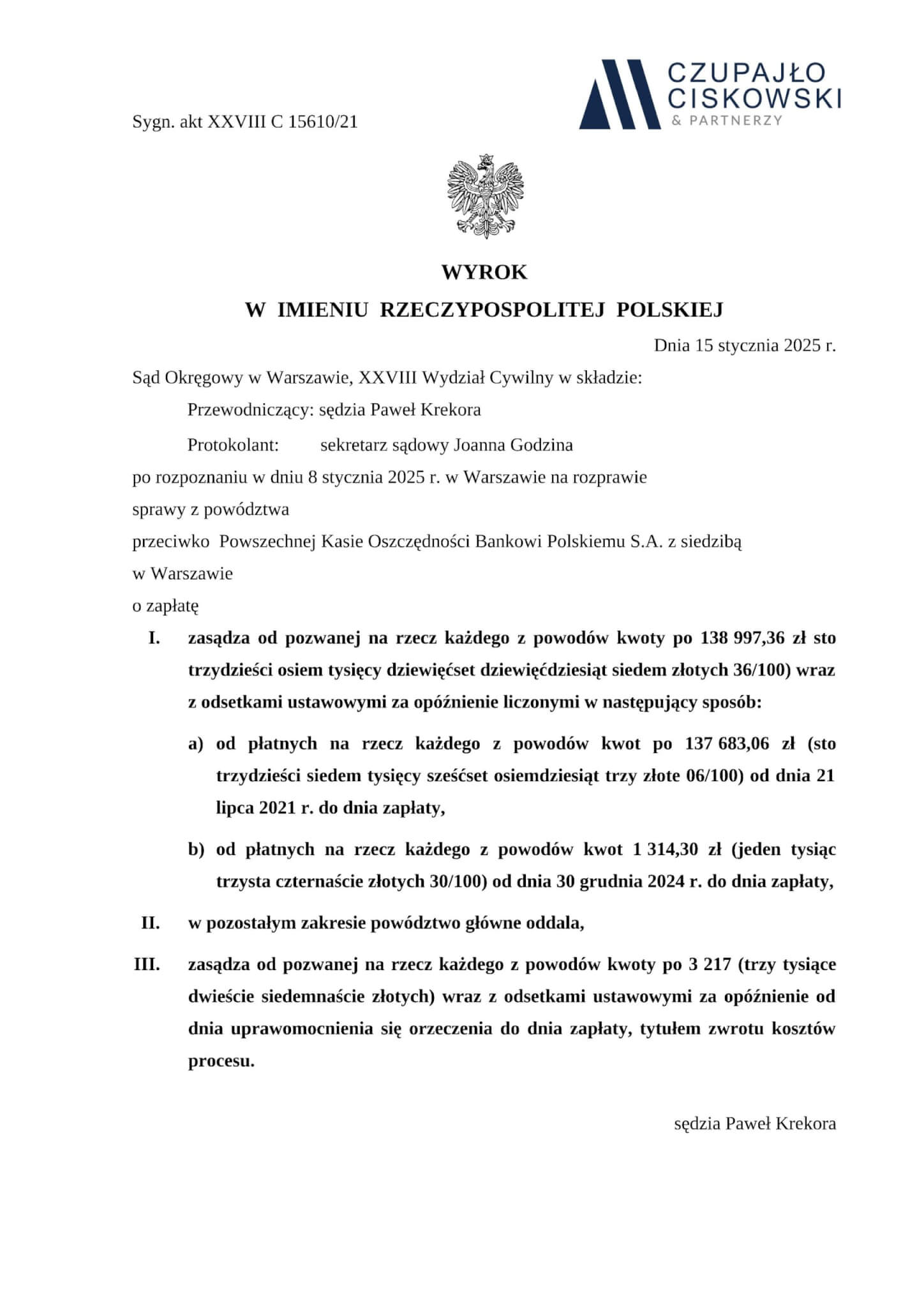 Sąd Okręgowy w Warszawie, XXVIII Wydział Cywilny w składzie Sędziego Przewodniczącego Pawła Krekora wyrokiem z dnia 15 stycznia 2025 r. w sprawie przeciwko Powszechnej Kasie Oszczędności Bankowi Polskiemu S.A. z siedzibą w Warszawie prowadzonej pod sygn. akt XXVIII C 15610/21 zasądził na rzecz naszych Klientów kwotę 275 366,14 PLN wraz z odsetkami ustawowymi od dnia wskazanego w wezwaniu do zapłaty oraz kwotę 2 628,66 PLN wraz z odsetkami ustawowymi za opóźnienie od dnia następnego po doręczeniu Pozwanemu modyfikacji powództwa do dnia zapłaty.