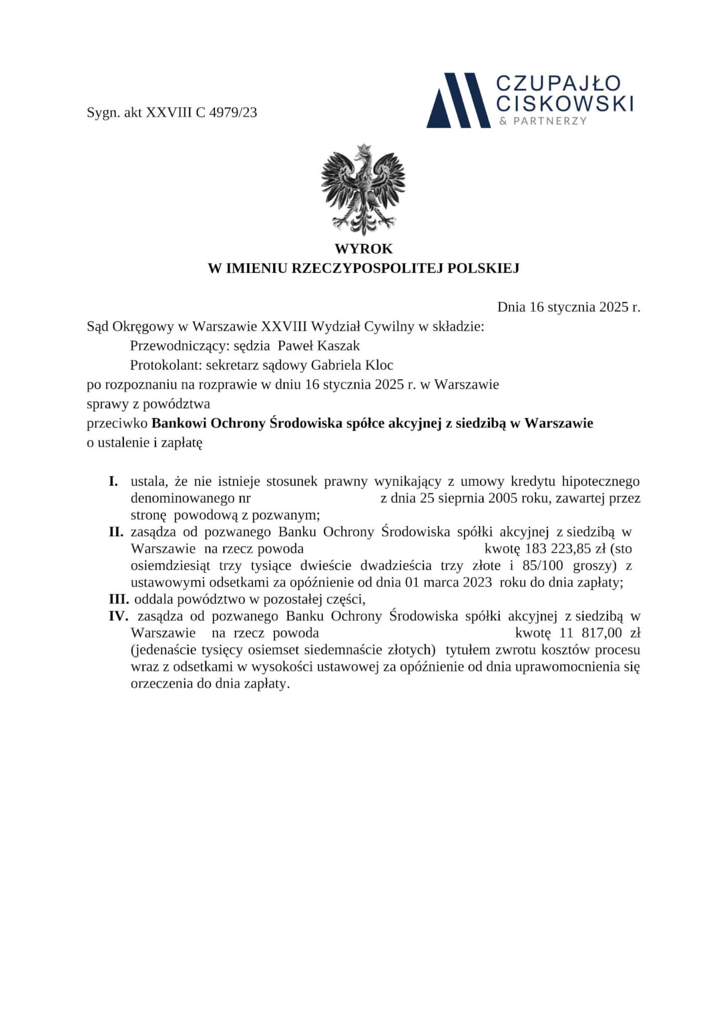 Sąd Okręgowy w Warszawie, XXVIII Wydział Cywilny w składzie Sędziego Przewodniczącego Pawła Kaszaka wyrokiem z dnia 16 stycznia 2025 r. w sprawie przeciwko Bankowi Ochrony Środowiska S.A. z siedzibą w Warszawie prowadzonej pod sygn. akt XXVIII C 4979/23 ustalił, że umowa kredytu hipotecznego łącząca naszego Klienta z bankiem jest nieważna. Ponadto zasądził na rzecz naszego Klienta kwotę 183 223,85 PLN wraz z odsetkami ustawowymi od dnia wskazanego w wezwaniu do zapłaty.