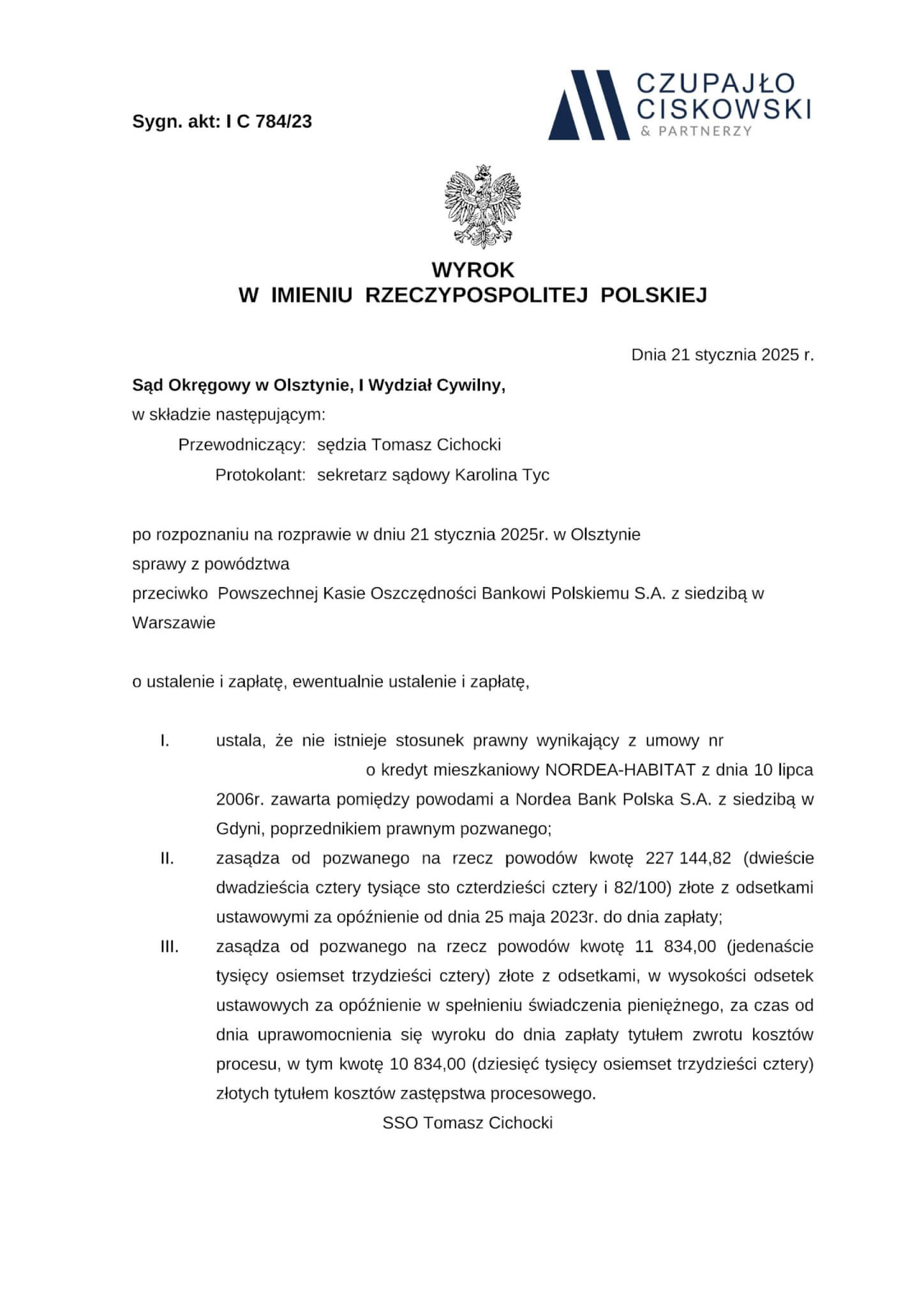 Sąd Okręgowy w Olsztynie, I Wydział Cywilny w składzie Sędziego Przewodniczącego Tomasza Cichockiego wyrokiem z dnia 21 stycznia 2025 r. w sprawie przeciwko Powszechnej Kasie Oszczędności Bankowi Polskiemu S.A. z siedzibą w Warszawie prowadzonej pod sygn. akt I C 784/23 ustalił, że umowa kredytu hipotecznego łącząca naszych Klientów z bankiem jest nieważna. Ponadto zasądził na rzecz naszych Klientów kwotę 227 144,82 PLN wraz z odsetkami ustawowymi od dnia wskazanego w wezwaniu do zapłaty.