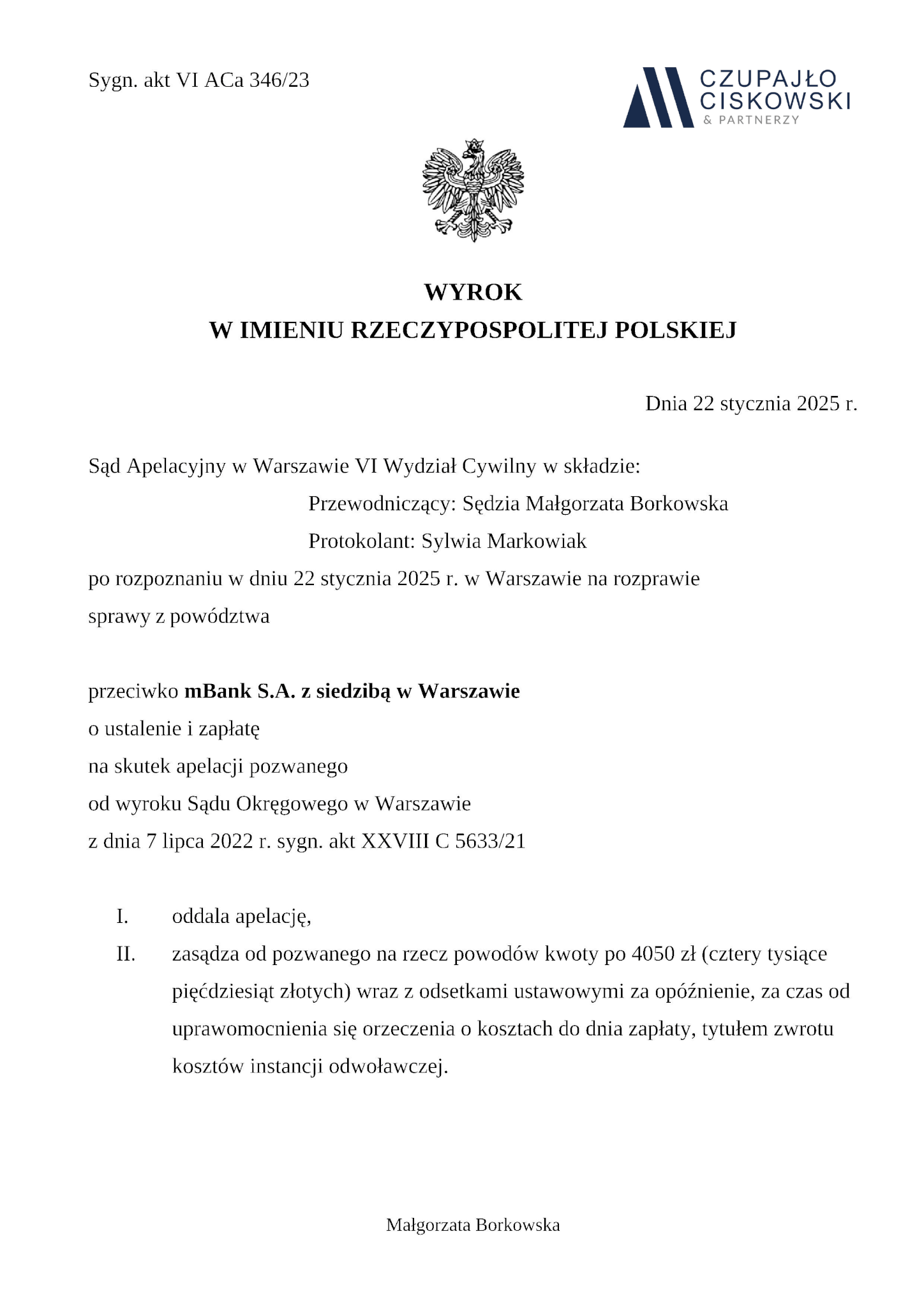 Sąd Apelacyjny w Warszawie VI Wydział Cywilny w składzie SSA Małgorzata Borkowska wyrokiem z dnia 22 stycznia 2025 r. w sprawie przeciwko mBank S.A., prowadzonej pod sygn. akt VI ACa 346/23 utrzymał w mocy wyrok Sądu Okręgowego w Warszawie XXVIII Wydział Cywilny (sygn. akt XXVIII C 5633/21) poprzez oddalenie w całości apelacji Pozwanego.