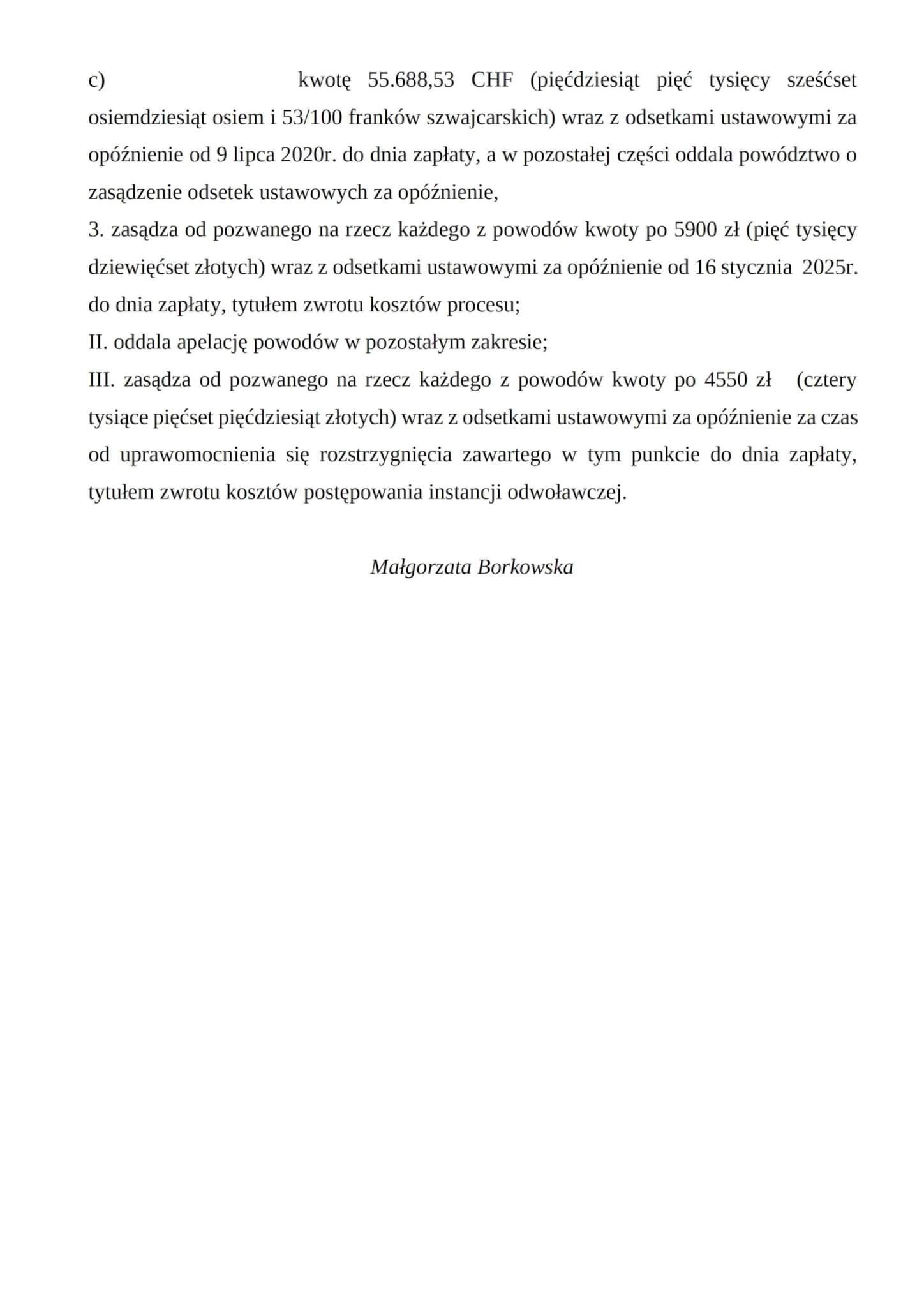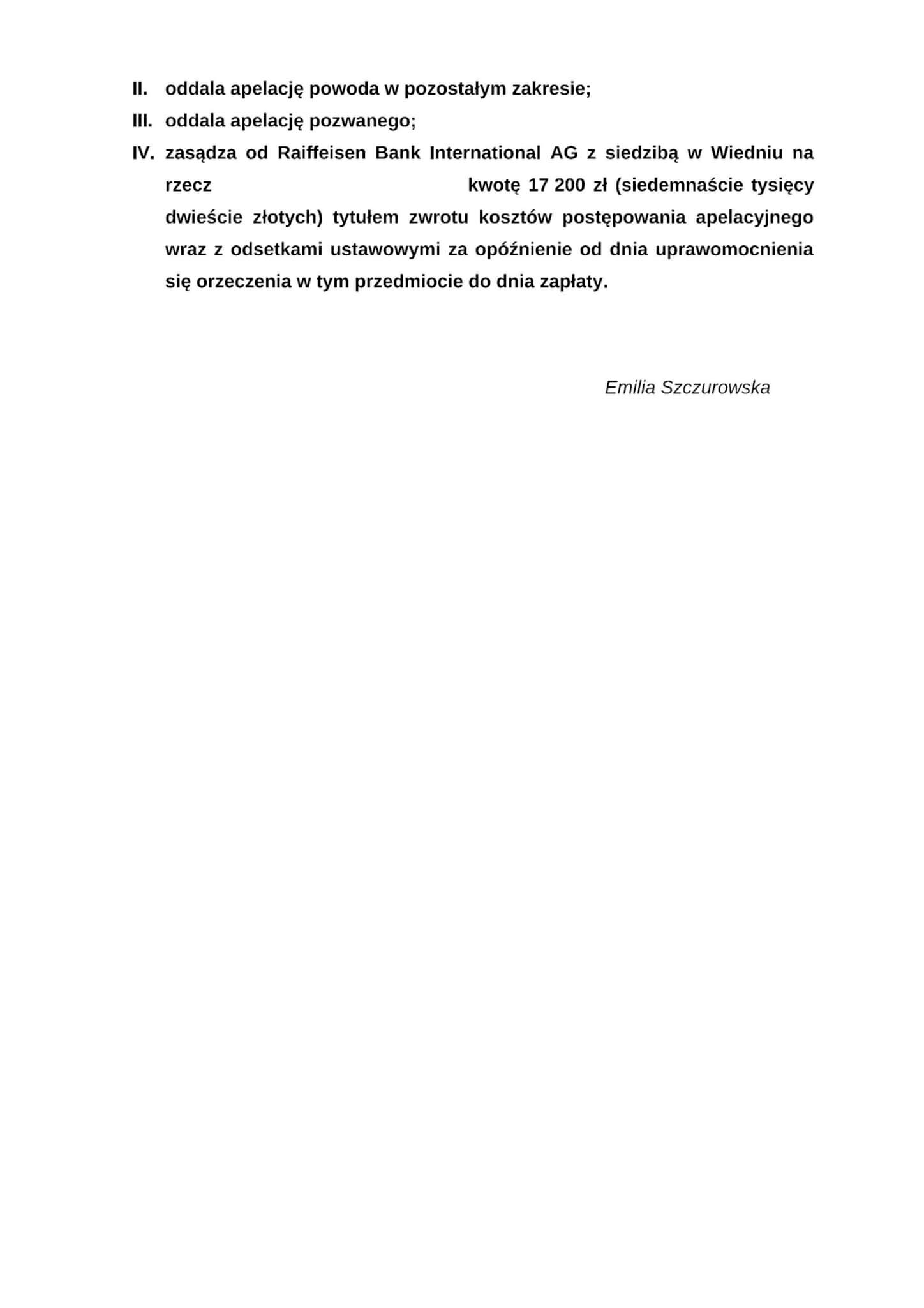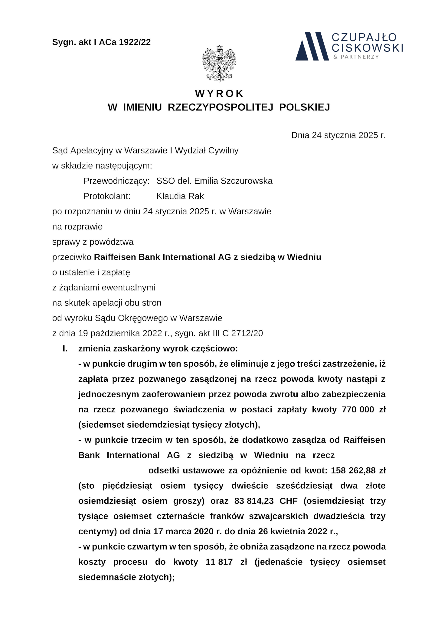 Sąd Apelacyjny w Warszawie I Wydział Cywilny w składzie sędzia del. Emilia Szczurowska wyrokiem z dnia 24 stycznia 2025 r. w sprawie przeciwko Raiffeisen Bank International AG działający przez Raiffeisen Bank International AG (Spółka Akcyjna) Oddział w Polsce, prowadzonej pod sygn. akt I ACa 1922/22 zmienił wyrok Sądu Okręgowego w Warszawie III Wydział Cywilny (sygn. akt III C 2712/20) w ten sposób, że wyeliminował z wyroku sądu pierwszej instancji zarzut zatrzymania, a także zasądził na rzecz naszych Klientów kwoty 158 262,88 PLN oraz 83 814,23 CHF od dnia wskazanego w wezwaniu do zapłaty
