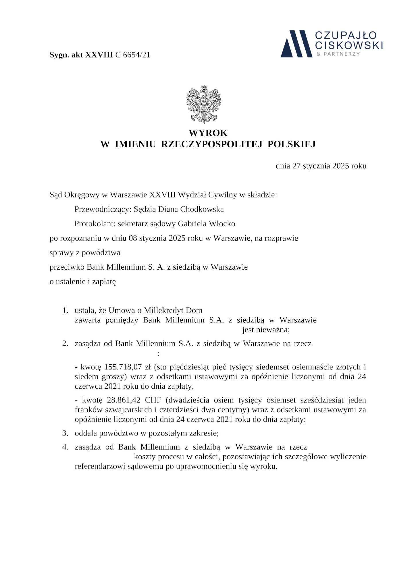 Sąd Okręgowy w Warszawie, XXVIII Wydział Cywilny w składzie SSO Agnieszka Wlekły-Pietrzak wyrokiem z dnia 10 stycznia 2025 r. w sprawie przeciwko Bankowi Millennium S.A. w Warszawie zasądził na rzecz naszych Klientów kwotę 52 806,76 CHF wraz z odsetkami ustawowymi od dnia wskazanego w wezwaniu do zapłaty.