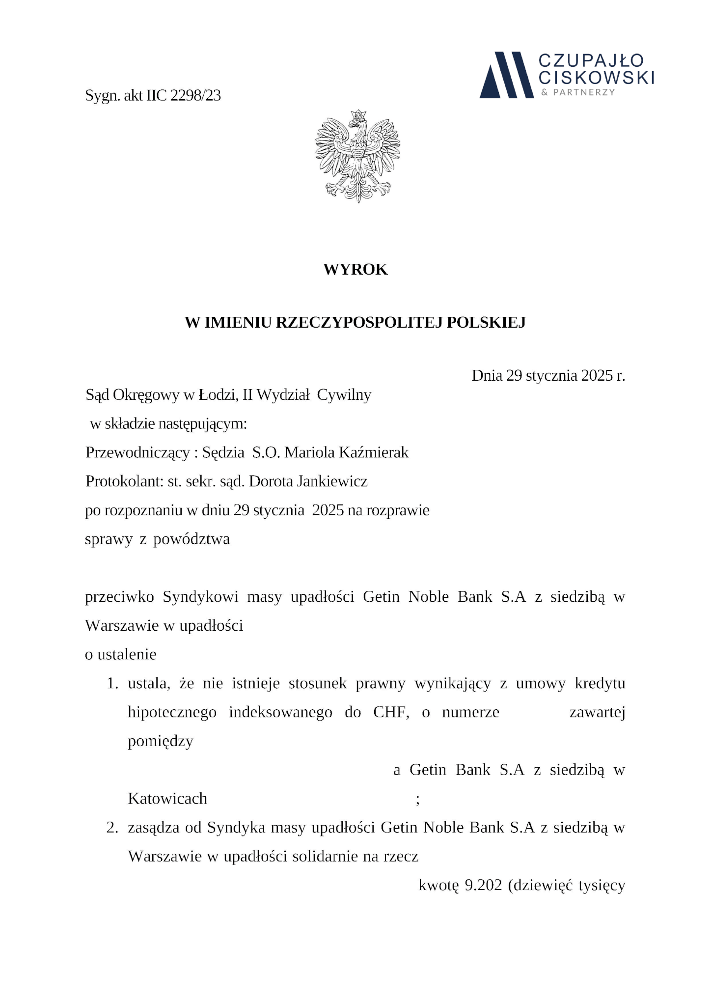 Sąd Okręgowy w Warszawie, XXVIII Wydział Cywilny w składzie SSO Agnieszka Wlekły-Pietrzak wyrokiem częściowym z dnia 17 stycznia 2025 r. w sprawie przeciwko Syndykowi masy upadłości Getin Noble Bank S.A. w Warszawie w upadłości prowadzonej pod sygn. akt XXVIII C 12862/23 ustalił, że umowa kredytu hipotecznego łącząca naszą Klientkę z bankiem jest nieważna.