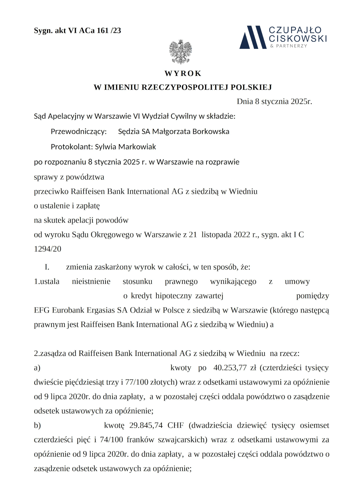 Sąd Apelacyjny w Warszawie, VI Wydział Cywilny w składzie Sędzia SA Małgorzata Borkowska wyrokiem z dnia 8 stycznia w sprawie przeciwko Raiffeisen Bank International AG z siedzibą w Wiedniu, prowadzonej pod sygn. akt VI ACa 161/23 zmienił wyrok Sądu Okręgowego w Warszawie (sygn. akt I C 1294/20) w ten sposób, że ustalił nieistnienie stosunku prawnego wynikającego z umowy kredytu oraz zasądził na rzecz naszych Klientów kwotę 40 253.77 zł, 55 688,53 CHF oraz 29 845.74 CHF wraz z odsetkami ustawowymi za opóźnienia