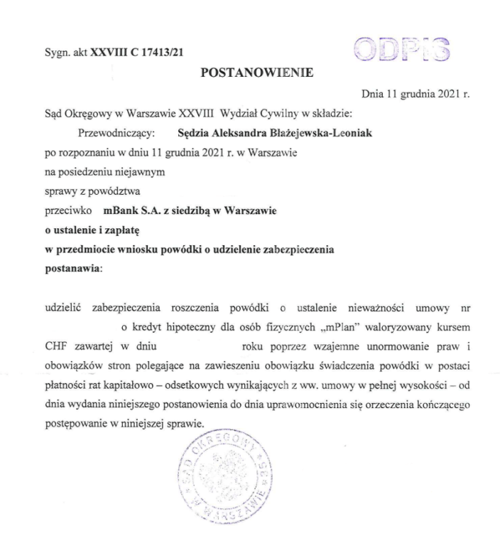 Sąd Okręgowy w Warszawie w składzie SSO Aleksandra Błażejewska-Leoniak po rozpoznaniu w dniu 11 grudnia 2021 r. na posiedzeniu niejawnym sprawy z powództwa naszej Klientki przeciwko mBank S.A. z siedzibą w Warszawie o ustalenie i zapłatę, sygn. akt XXVIII C 17413/21, postanowił udzielić zabezpieczenia roszczenia o ustalenie nieważności umowy o kredyt hipoteczny dla osób fizycznych „mPlan”.