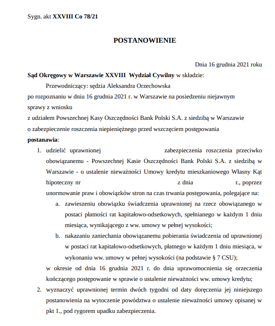 Sąd Okręgowy w Warszawie w składzie SSO Aleksandra Orzechowska po rozpoznaniu w dniu 16 grudnia 2021 r. na posiedzeniu niejawnym sprawy z powództwa naszych Klientów przeciwko Powszechna Kasa Oszczędności Bank Polski S.A. z siedzibą w Warszawie o ustalenie i zapłatę, sygn. akt. XXVIII C Co 78/21, postanowił udzielić zabezpieczenia roszczenia o ustalenie nieważności umowy kredytu hipotecznego.
